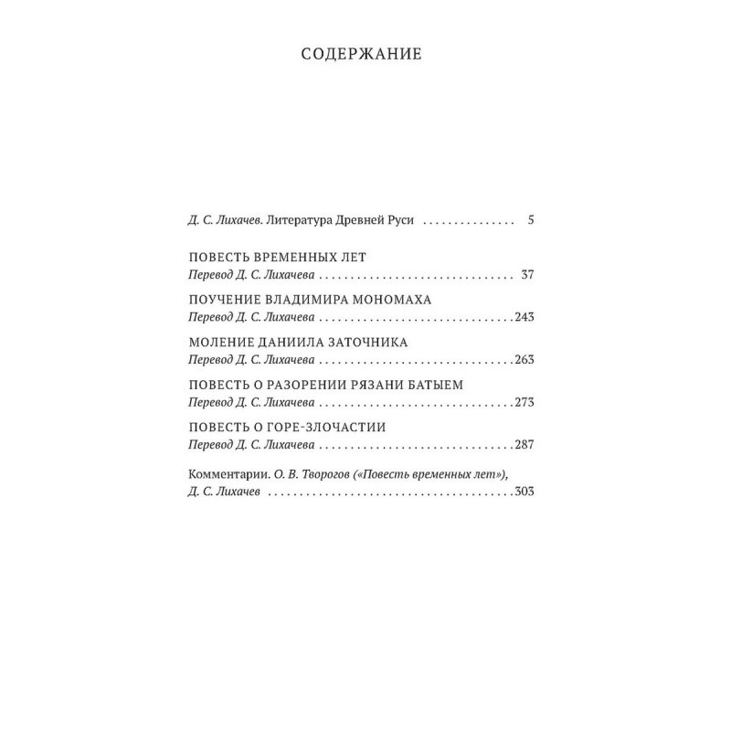 В сборник включены ключевые произведения древнерусской литературы XII–XVII веков, наглядно отражающие ее жанровую, стилистическую и образно-тематическую многоликость: «Повесть временных лет» — первая русская летопись, созданная монахом Киево-Печерского монастыря Нестором; «Поучение» великого князя Киевского Владимира Мономаха — первая русская светская проповедь; «Моление Даниила Заточника» – один из ранних опытов русской дворянской публицистики; «Повесть о разорении Рязани Батыем» и «Повесть о Горе-Злочастии». Все тексты публикуются в переводах выдающегося русского литературоведа, академика Д. С. Лихачева и снабжены подробными комментариями.