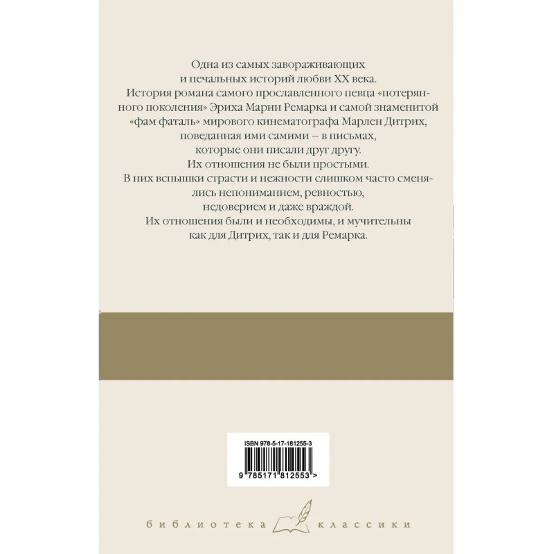 — Эрих Мария Ремарк — один из величайших писателей XX века, автор романов «На западном фронте без перемен», «Три товарища» и «Триумфальная арка». Марлен Дитрих — знаменитая актриса и певица, икона стиля, оказавшая огромное влияние на современную моду. — В данное издание вошла сохранившаяся переписка между Ремарком и Дитрих, из которой складывается история одной из самых завораживающих и печальных историй любви всего XX века. — Еще ни в одной своей книге Ремарк не был таким честным, откровенным и уязвимым и не выражал столь открыто свои мысли о любви, женщинах, войне и мире. — Издание в коллекционном оформлении серии «Библиотека классики»: суперобложка, минималистичный переплет бумвинил, качественная бумага.