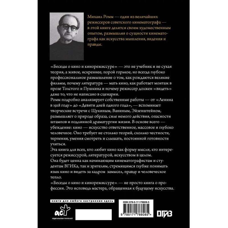 "Беседы о кино и кинорежиссуре" — это не учебник и не сухая теория, а живое, искреннее, порой горькое, но всегда глубоко профессиональное размышление о том, как рождаются великие фильмы, почему литература — мать кино, как работает монтаж в прозе Толстого и Пушкина и почему режиссёр должен "видеть" даже то, что не написано в сценарии. Ромм подробно анализирует собственные работы — от "Ленина в 1918 году" до "Девяти дней одного года", — вспоминает творческие встречи с Щукиным, Ваниным, Эйзенштейном, размышляет о природе образа, силе немого действия, опасности штампов и подлинной драматургии жизни. В основе всего — убеждение: кино — искусство ответственное, массовое и глубоко человечное. Оно требует не столько теорий, сколько честности, терпения, умения смотреть и слышать, постоянной готовности учиться. Эта книга для всех, кто любит кино как форму мысли, кто интересуется режиссурой, литературой, искусством в целом.