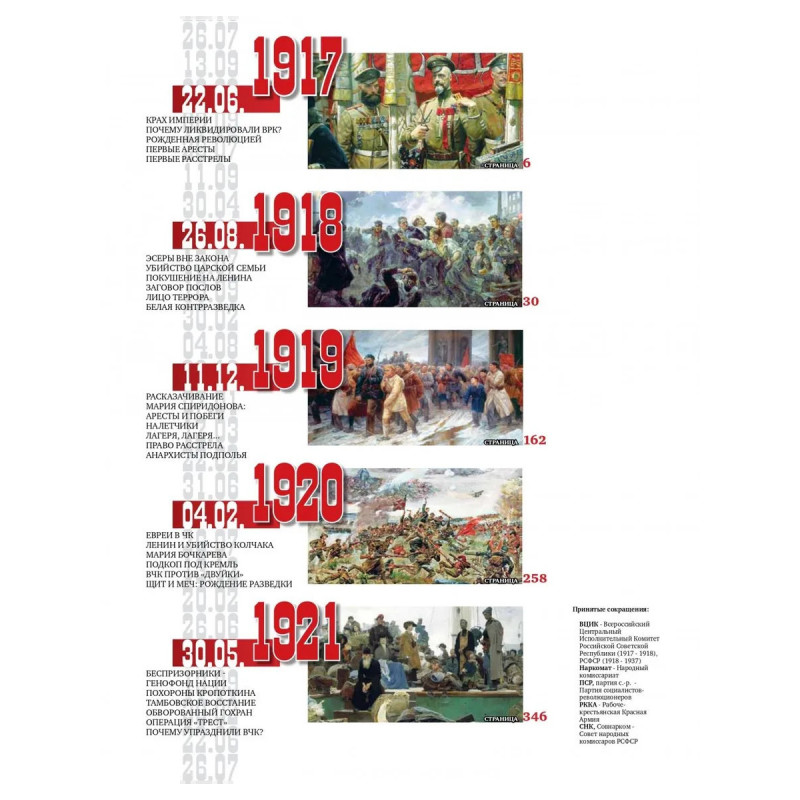 Уникальный альбом - совместный труд Издательского дома "Комсомольская правда" и Общественного совета при ФСБ России. Большая группа историков, экспертов и ветеранов cлужбы нашла и подобрала главные документы истории грозной организации - В.Ч.К., ставшей на защиту молодого государства, рожденного на обломках Российской империи сто лет назад. Многие из этих документов и фотографий опубликованы впервые.