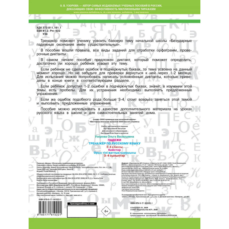 Все правила. Все виды заданий для отработки орфограмм. Проверочные диктанты. Тренажёр поможет ученику усвоить базовую тему начальной школы «Безударные падежные окончания имён существительных». Пособие можно использовать в качестве дополнительного материала на уроках русского языка в школе и для самостоятельных занятий дома.