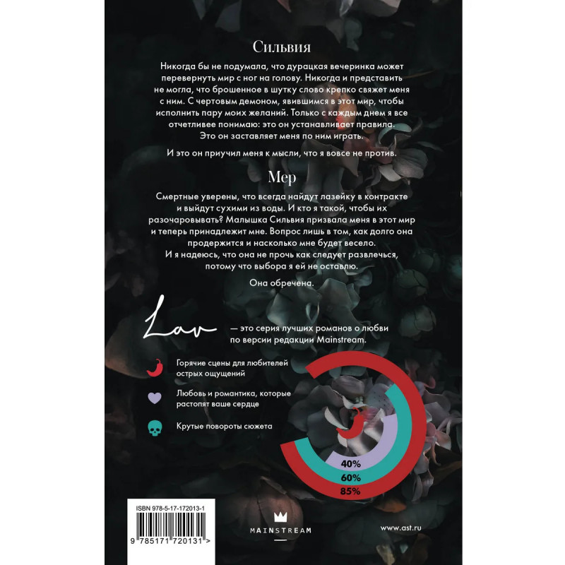– Терпкая история в жанре темная романтика. – Властный и страстный демон, призванный случайно, пришел исполнить ее желания. Но он скрывает больше, чем может показаться. – Эмоционально насыщенная история с жаркими сценами о сломанных судьбах. – Для поклонников романов «Поцелуй смерти» и «Прикосновение смерти» Элис Вайлд, «Прикосновение тьмы» Скарлетт Сент-Клэр и «Исповедь» Сьерры Симоне.