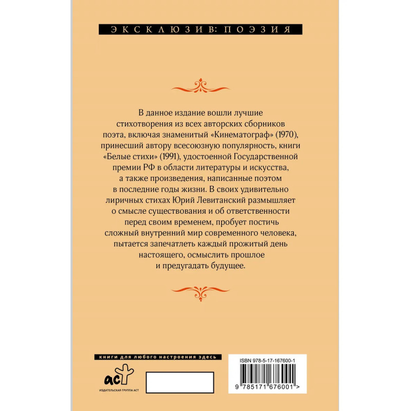 В данное издание вошли лучшие стихотворения из всех авторских сборников поэта, включая знаменитый "Кинематограф" (1970), принесший автору всесоюзную популярность, книги "Белые стихи" (1991), удостоенной Государственной премии РФ в области литературы и искусства, а также произведения, написанные поэтом в последние годы жизни. В своих удивительно лиричных стихах Юрий Левитанский размышляет о смысле существования и об ответственности перед своим временем, пробует постичь сложный внутренний мир современного человека, пытается запечатлеть каждый прожитый день настоящего, осмыслить прошлое и предугадать будущее.