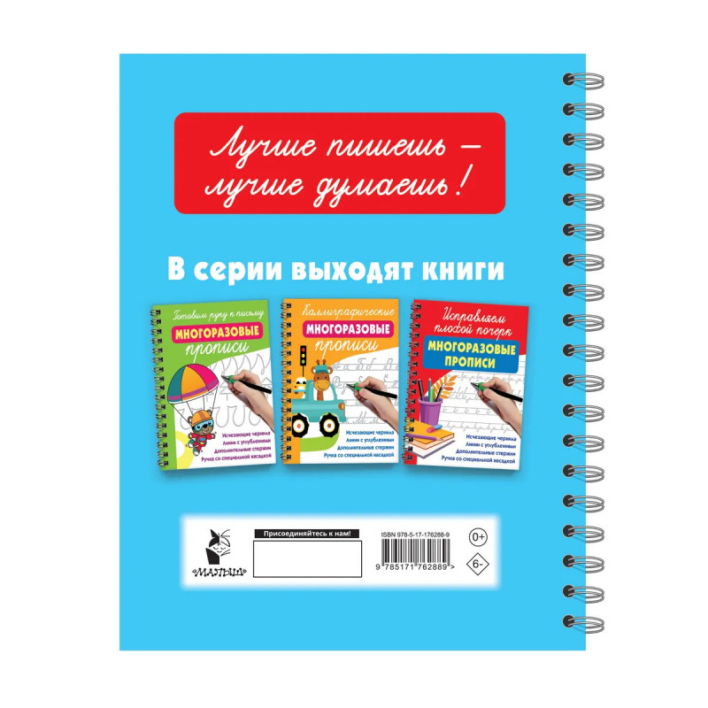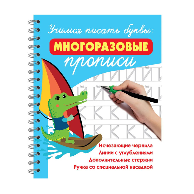 Улучшить почерк и научиться писать красиво юным ученикам помогут «Учимся писать буквы: многоразовые прописи» В наборе — ручка, 10 запасных стержней с ичезающими чернилами и насадка для правильного формирования почерка. Можно тренироваться хоть тысячу раз! «Учимся писать буквы: многоразовые прописи» дополнены увлекательными играми, которые развивают логику и внимательность. Благодаря этой книге ребёнок не только улучшит навыки письма, но и разовьёт мелкую моторику, мышление и умственные способности. Прописи сделаны из плотного картона, что гарантирует её долгое использование. Она станет отличным помощником в раннем обучении письму и поможет ребёнку достичь высоких результатов.