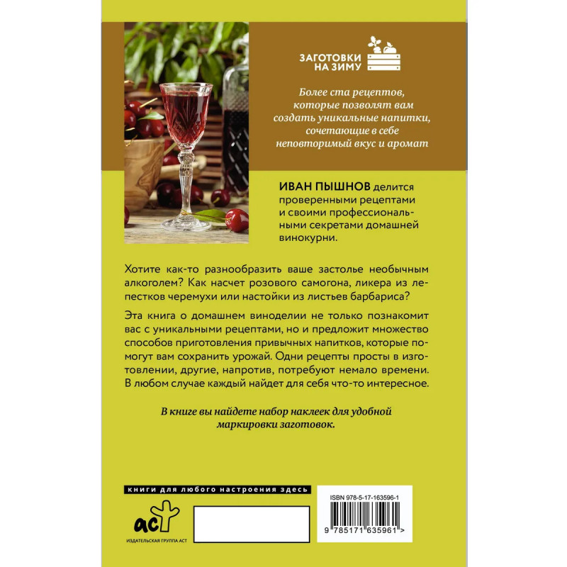 Хотите разнообразить ваше застолье необычным алкоголем? Удивите ваших гостей розовым самогоном, ликером из лепестков черемухи или настойкой из листьев барбариса. Думаете, это сложно приготовить? Вам поможет книга Ивана Пышнова «Домашняя винокурня», в которой автор делится проверенными рецептами и профессиональными секретами домашней винокурни. Даже если вы совсем новичок в приготовлении напитков, с книгой «Домашняя винокурня» вы легко освоите все премудрости домашнего самогоноварения. В книге о вине вы найдете более ста рецептов по приготовлению домашнего самогона, вина, настоек, наливок, ликера, компотов, морсов и соков. Создайте напитки, сочетающие в себе неповторимый вкус и аромат. В кулинарной книге вы найдете авторские рецепты, проверенные годами, а также разнообразные секреты создания напитков с оригинальным вкусом и ароматом. Побалуйте себя и близких оригинальными рецептами домашнего самогона, вина, настоек, наливок, ликера, компотов, морсов и соков.