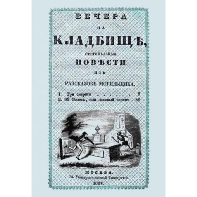 Вечера на кладбище, оригинальныя повести из разсказов могильщика. Три смерти. Любецкий С.М. Репринт с издания. Москва. В Университетской тип., 1837. Содержание: 1) Три смерти, 2) Волос или лаковый череп. Любецкий Сергей Михайлович (1808 или 1810 - 1881), литератор, историк, искусствовед, педагог; надворный советник (1865). В 1837 опубликовал книгу "Вечера на кладбище" (части 1-3), содержавшую наряду со "страшными" рассказами бытовые повести с колоритными зарисовками купеческой жизни. Книга изготовлена по технологии "печать по требованию".