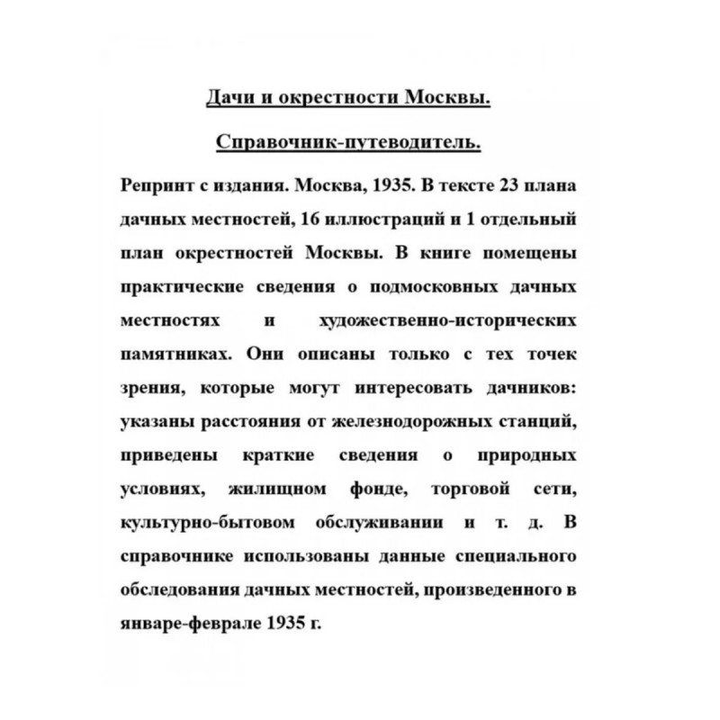 Дачи и окрестности Москвы. Справочник-путеводитель. Репринт с издания. Москва, 1935. В тексте 23 плана дачных местностей, 16 иллюстраций и 1 отдельный план окрестностей Москвы. В книге помещены практические сведения о подмосковных дачных местностях и художественно-исторических памятниках. Они описаны только с тех точек зрения, которые могут интересовать дачников: указаны расстояния от железнодорожных станций, приведены краткие сведения о природных условиях, жилищном фонде, торговой сети, культурно-бытовом обслуживании и т. д. В справочнике использованы данные специального обследования дачных местностей, произведенного в январефеврале 1935 г.