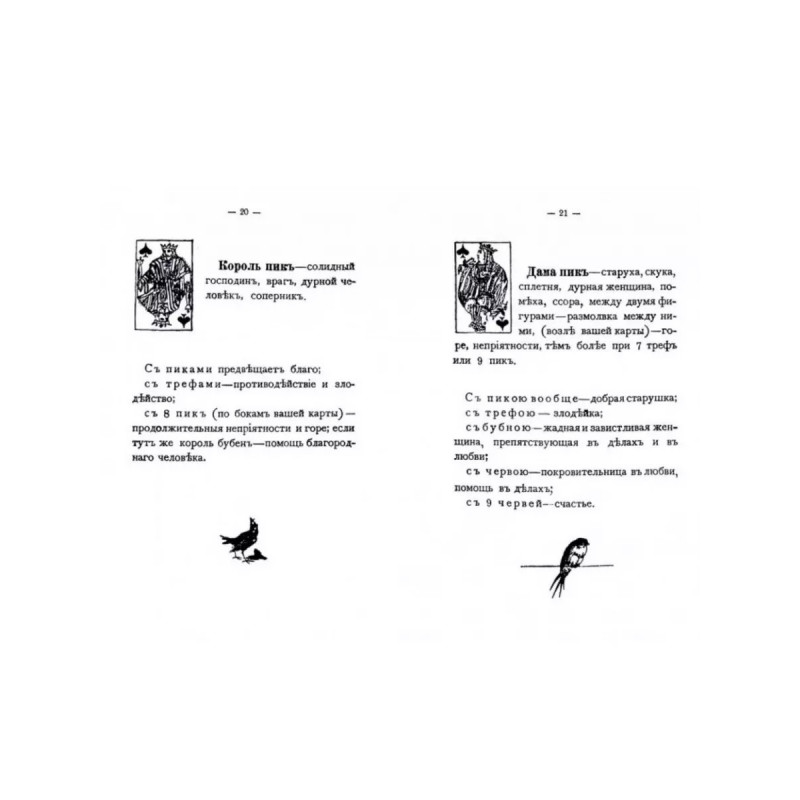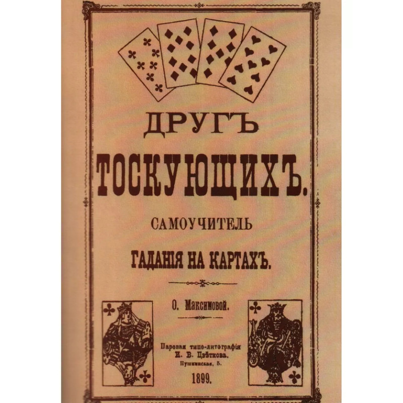 Друг тоскующих. Самоучитель гадания на картах. Максимова О.И. Репринт с издания. СПб., 1899. В гадании используется колода из 36 игральных карт. Приведено подробное описание значений карт в зависимости от их расположения и сочетания. Составительница книги - Ольга Ивановна Максимова выпустила также несколько пособий для изучения иностранных языков. Проживала в Петербурге, по адресу Невский проспект, д. 110.