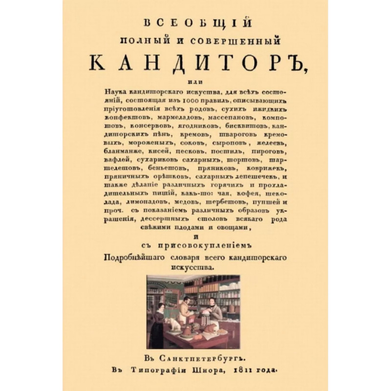 Всеобщий полный и совершенный кандитор. Репринт с издания. СПб., 1811. Полное название: Всеобщий полный и совершенный кандитор, или Наука кандиторскаго искуства. для всех состояний, состоящая из 1000 правил, описывающих приуготовления всех родов, сухих и жидких конфектов, мармеладов, массепанов, компотов, консервов, ягодников, бисквитов, кандиторских пен, кремов, тварогов кремовых, мороженых, соков, сыропов, желеев, бланманже, кисей, песков, постил, пирогов, вафлей, сухариков сахарных, тортов, тартелетов, беньетов, пряников, коврижек, пряничных орешков, сахарных лепешечек, и также делание различных горячих и прохладительных питий, как то: чая, кофея, шеколада, лимонадов, медов, шербетов, пуншей и проч. С показанием различных образов украшения, десертных столов всякаго рода свежими плодами и овощами, и с присовокуплением Подробнейшаго словаря всего кандиторскаго искусства.