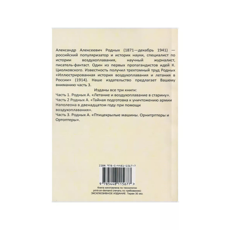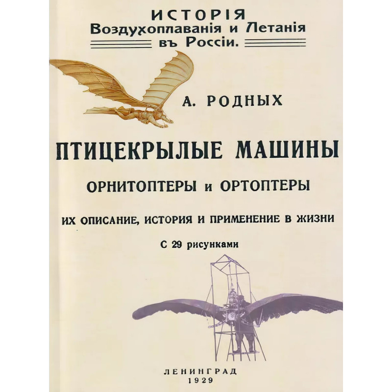 Книга «История Воздухоплавания и Летания в России. Птицекрылые машины Орнитоптеры и Ортоптеры» Александра Алексеевича Родных — репринт издания 1929 года из Ленинграда. Тираж выполнен по технологии print-on-demand. В книге рассказывается об истории и применении птицекрылых аппаратов. Орнитоптер — летательная машина с бьющими крыльями, наподобие птицы. Ортоптер — аппарат, в котором крылья поднимаются прямо вверх и опускаются также вниз («прямокрылый», от греческих слов «ортос» — прямой и «птерои» — крыло).