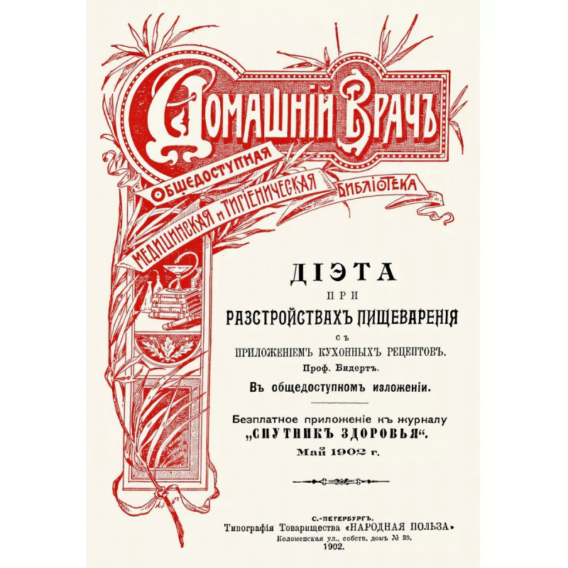 Диета при расстройствах пищеварения. С приложением кухонных Рецептов. Бидерт Филипп. Репринт с издания. Санкт-Петербург, тип. т-ва "Нар. польза", 1902. Проф. Бидерт. (Домашний врач. Общедоступ. мед. и гигиен. б-ка). В первой части книги рассмотрены болезни пищеварительных органов, общие методы их лечения Во 2-й части - основы диэтики, 7 разных диет, с росписью кушаний по времени принятия и дням недели. Третья часть - отдел поваренный: принципы отбора, приготовление разных продуктов и блюд.Книга изготовлена по технологии "печать по требованию". Тираж 30 экз.
