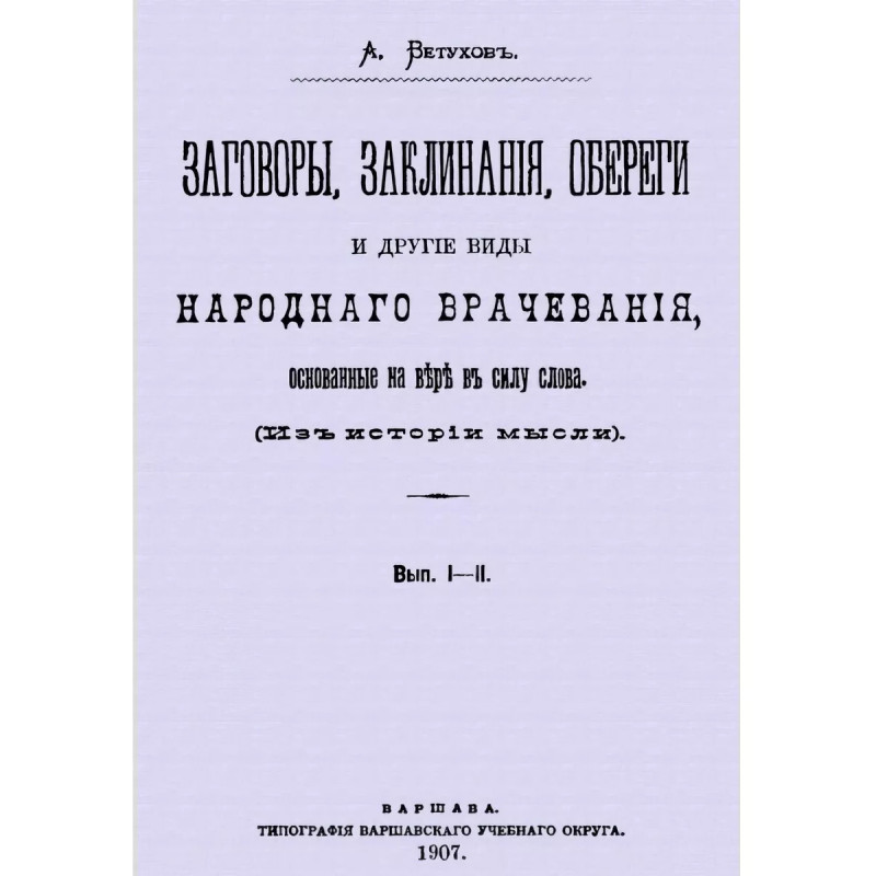 Заговоры, заклинания, обереги и другие виды народного врачевания, основанные на вере в силу слова. Вып. I-II. Ветухов А. В. Репринт с издания. Варшава, 1907. Ветухов Алексей Васильевич (1869-1946), филолог, фольклорист. Взяв для исследования тему заговоров и заклинаний, автор считал, что особых исследований, им посвященных, почти совсем не существует ни в русской, ни в европейской литературе. При таком положении дел он видел свою задачу исследователя в том, чтобы группировать и изучать наличный материал, вскрыв те основы, на которых созидалась вера в чудесную силу заговора. Содержание: Введение; Мнения ученых и исследователей о заговорах; Психологические основания возникновения заговоров; Формальная сторона заговора; Заговоры от лихорадки; Заговоры от сглаза; Заговоры от крови; Заговоры от зубной боли; Заговоры от болезней, реже встречающихся; Заговоры от болезней, реже встречающихся, применяемые к нескольким болезням сразу; Послесловие; Источники и пособия. Тираж 30 экз. выполнен по технологии print-on-demand.