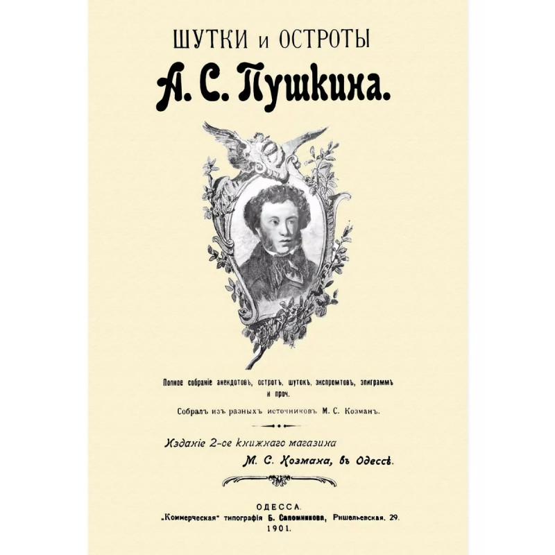 Шутки и остроты Пушкина. 1901 год. Пушкин А. С. Репринт с издания. Одесса, 1901. Содержание книги: Полное собрание анекдотов, острот, шуток, экспромтов, эпиграмм и проч. Собрал из разных источников М. С. Козман. Вышло 2 издания с одинаковыми названиями: 1899 г. в СПб. и 1901 г. в Одессе. Они имеют совершенно разное содержание. Мы рады предложить Вашему вниманию обе эти книги. Тираж 30 экз. выполнен по технологии print-on-demand.