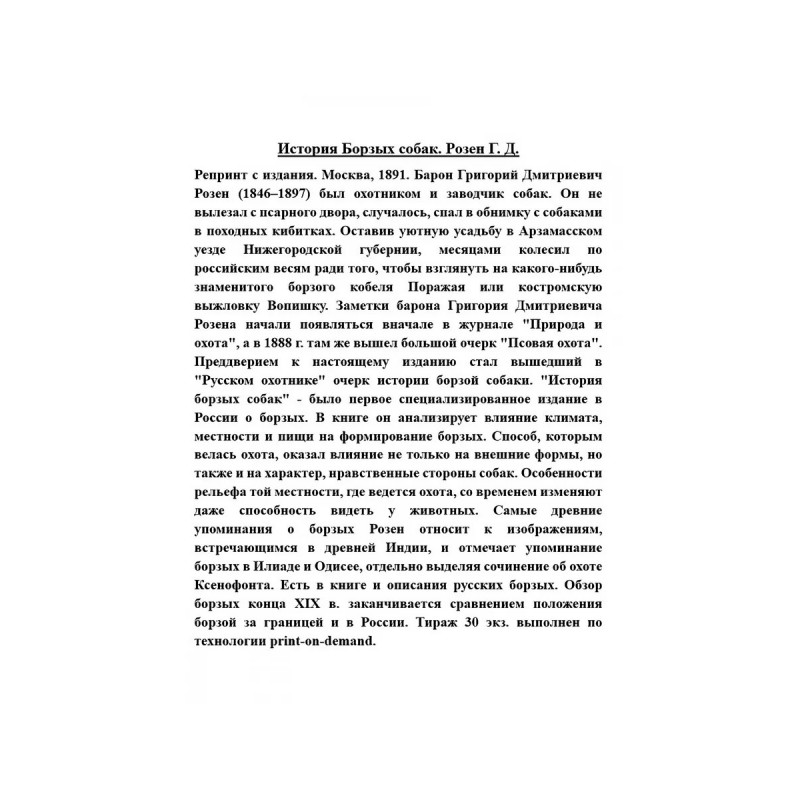 История Борзых собак. Розен Г.Д. Репринт с издания. Москва, 1891. Барон Григорий Дмитриевич Розен (1846-1897) был охотником и заводчик собак. Он не вылезал с псарного двора, случалось, спал в обнимку с собаками в походных кибитках. Оставив уютную усадьбу в Арзамасском уезде Нижегородской губернии, месяцами колесил по российским весям ради того, чтобы взглянуть на какого-нибудь знаменитого борзого кобеля Поражая или костромскую выжловку Вопишку. Заметки барона Григория Дмитриевича Розена начали появляться вначале в журнале "Природа и охота", а в 1888 г. там же вышел большой очерк "Псовая охота". Преддверием к настоящему изданию стал вышедший в "Русском охотнике" очерк истории борзой собаки. "История борзых собак" - было первое специализированное издание в России о борзых. В книге он анализирует влияние климата, местности и пищи на формирование борзых. Способ, которым велась охота, оказал влияние не только на внешние формы, но также и на характер, нравственные стороны собак. Особенности рельефа той местности, где ведется охота, со временем изменяют даже способность видеть у животных. Самые древние упоминания о борзых Розен относит к изображениям, встречающимся в древней Индии, и отмечает упоминание борзых в Илиаде и Одисее, отдельно выделяя сочинение об охоте Ксенофонта. Есть в книге и описания русских борзых. Обзор борзых конца XIX в. заканчивается сравнением положения борзой за границей и в России. Тираж 30 экз. выполнен по технологии print-on-demand.