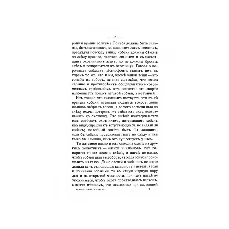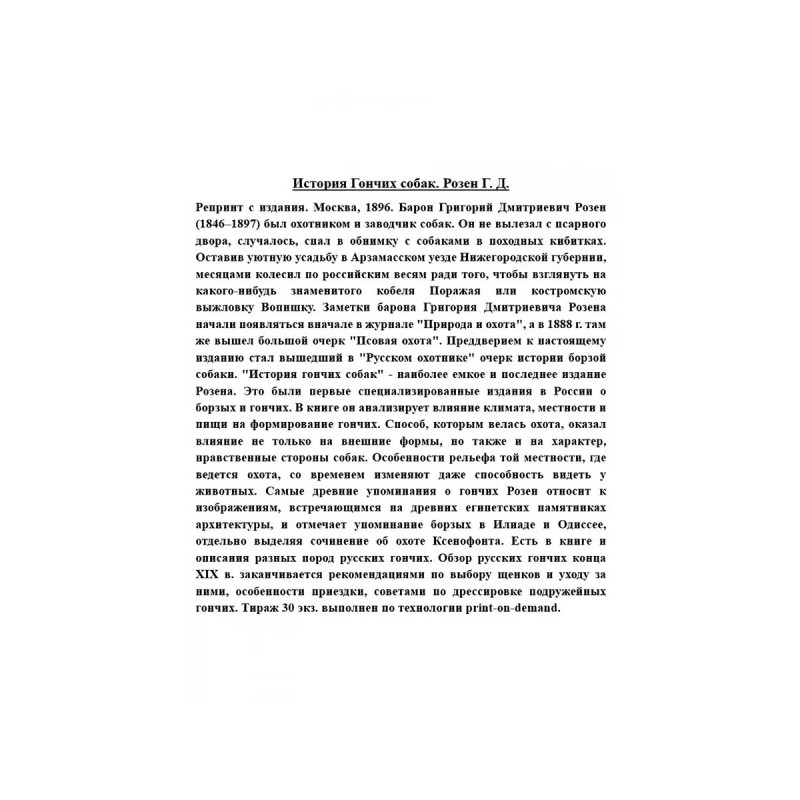 История Гончих собак. Розен Г.Д. Репринт с издания. Москва, 1896. Барон Григорий Дмитриевич Розен (1846-1897) был охотником и заводчик собак. Он не вылезал с псарного двора, случалось, спал в обнимку с собаками в походных кибитках. Оставив уютную усадьбу в Арзамасском уезде Нижегородской губернии, месяцами колесил по российским весям ради того, чтобы взглянуть на какого-нибудь знаменитого кобеля Поражая или костромскую выжловку Вопишку. Заметки барона Григория Дмитриевича Розена начали появляться вначале в журнале "Природа и охота", а в 1888 г. там же вышел большой очерк "Псовая охота". Преддверием к настоящему изданию стал вышедший в "Русском охотнике" очерк истории борзой собаки. "История гончих собак" - наиболее емкое и последнее издание Розена. Это были первые специализированные издания в России о борзых и гончих. В книге он анализирует влияние климата, местности и пищи на формирование гончих. Способ, которым велась охота, оказал влияние не только на внешние формы, но также и на характер, нравственные стороны собак. Особенности рельефа той местности, где ведется охота, со временем изменяют даже способность видеть у животных. Самые древние упоминания о гончих Розен относит к изображениям, встречающимся на древних египетских памятниках архитектуры, и отмечает упоминание борзых в Илиаде и Одиссее, отдельно выделяя сочинение об охоте Ксенофонта. Есть в книге и описания разных пород русских гончих. Обзор русских гончих конца XIX в. заканчивается рекомендациями по выбору щенков и уходу за ними, особенности приездки, советами по дрессировке подружейных гончих. Тираж 30 экз. выполнен по технологии print-on-demand.