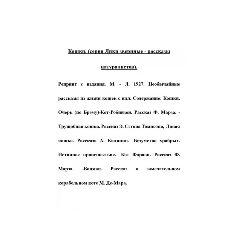 Кошки. Необычные рассказы о домашних и диких кошках. Репринт с издания. М. - Л. 1927. Необычайные рассказы из жизни кошек с илл. Содержание: Кошки. Очерк (по Брэму)-Кот-Робинзон. Рассказ Ф. Марза. -Трущобная кошка. Рассказ Э. Сэтона Томпсона,-Дикая кошка. Рассказа А. Калинин. -Безумство храбрых. Истинное происшествие. -Кот Фараон. Рассказ Ф. Марза. -Боцман. Рассказ о замечательном корабельном коте М. Де-Мара.