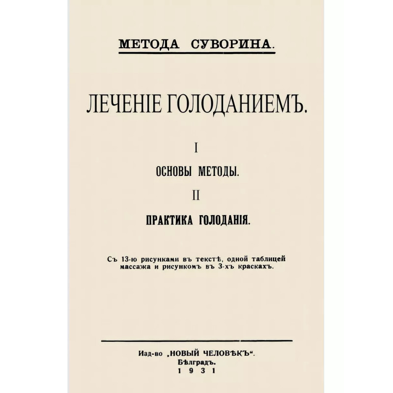 Лечение голоданием. I. Основы методы; II. Практика голодания. Суворин А. А. Репринт с издания. Белград, 1931. Суворин Алексей Алексеевич (1862-1937). публицист, писатель и издатель, отв. редактора газеты Новое время, популяризатор лечебного голодания, яркий и талантливый представитель альтернативной медицины, эмигрант, старший сын крупнейшего отечественного издателя А. С. Суворина (1834-1912). Псевдоним Алексей Порошин. В зрелом возрасте он стал врачом, окончив Белградский медицинский институт. В своей лечебной практике А. А. Суворин разработал эффективную методику лечебного голодания, лечение по которой можно проводить в домашних условиях. Его методика лечения болезней голоданием отличается простотой и физиологичностью. Она доступна практически всем людям любого возраста, но требует при ее применении строжайшей дисциплины и знания. Методика лечебного голодания является первым шагом не только к лечению болезней, но и первым шагом к здоровому образу жизни. Девиз А. А. Суворина пища должна быть вкусна, дешева и доступна особое значение имеет и в наши дни, когда питание людей по стоимости и составу продуктов не соответствует физиологическим потребностям человека. Тираж 30 экз. выполнен по технологии print-on-demand. Книга напечатана на русском языке с дореволюционной (дореформенной) орфографией