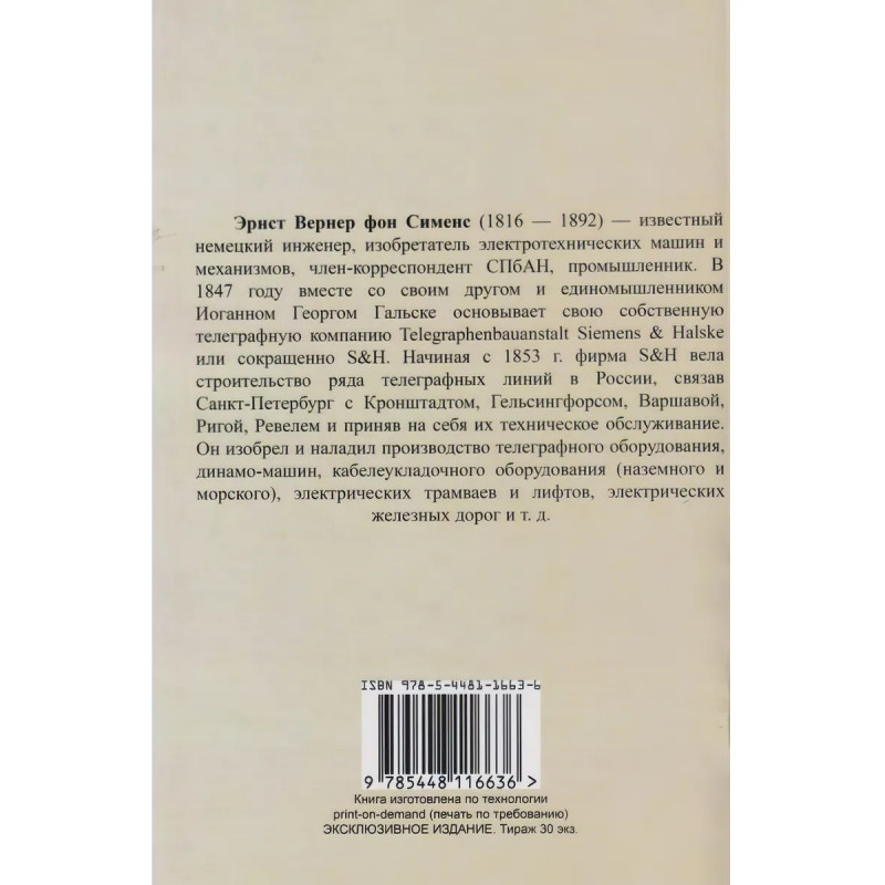 Мои воспоминания. Сименс В. Фон. Репринт с издания. СПб. , 1893. Эрнст Вернер фон Сименс (1816 - 1892) - известный немецкий инженер, изобретатель электротехнических машин и механизмов, член-корреспондент СПбАН, промышленник. В 1847 году вместе со своим другом и единомышленником Иоганном Георгом Гальске основывает свою собственную телеграфную компанию Telegraphenbauanstalt Siemens Halske или сокращенно SH. Начиная с 1853 г. фирма SH вела строительство ряда телеграфных линий в России, связав Санкт-Петербург с Кронштадтом, Гельсингфорсом, Варшавой, Ригой, Ревелем и приняв на себя их техническое обслуживание. Он изобрел и наладил производство телеграфного оборудования, динамо-машин, кабелеукладочного оборудования (наземного и морского), электрических трамваев и лифтов, электрических железных дорог и т. д.Книга изготовлена по технологии print-on-demand(печать по требованию)Перевод с немецкого под редакцией М.Б. ПаппеЭксклюзивное издание. Тираж 30 экз.Книга напечатана на русском языке с дореволюционной (дореформенной) орфографией.