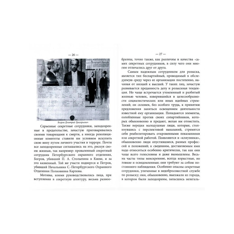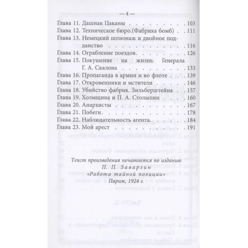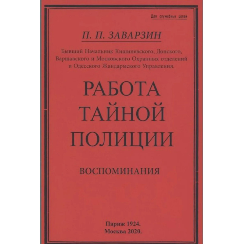 Печатается по тексту издания автора. Париж, 1924. Павел Павлович Заварзин (1868 — 1932) — российский жандармский офицер, генерал-майор Отдельного корпуса жандармов. Заварзин родился в семье дворян Херсонской губернии. В 1888 году в чине подпоручика он поступил на службу в 16-й Стрелковый Его Величества батальон, прослужил там 10 лет. В 1898 году в чине поручика он перешёл на службу в Отдельный корпус жандармов. Занимал должности: 1898 год — адъютант Бессарабского Губернского жандармского управления; 1899 год — адъютант Таврического Губернском жандармского управлении; 1900 год — помощник начальника Волочиского отделения Киевского Жандармского Полицейского Управления железных дорог; 1901 год — начальник Лубенского отделения Московско-Киевского Жандармского Полицейского Управления железных дорог; 1903 год — прикомандирован к Бессарабскому Губернскому жандармскому управлению; 1904 год — помощник начальника Могилевского Губернского жандармского управления в Гомельском уезде; 1904 год — в резерве при Жандармском уп