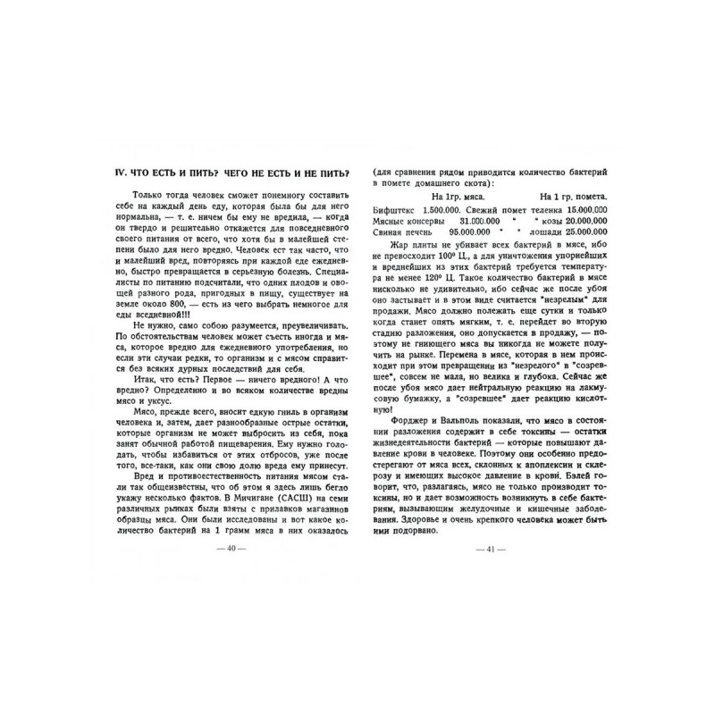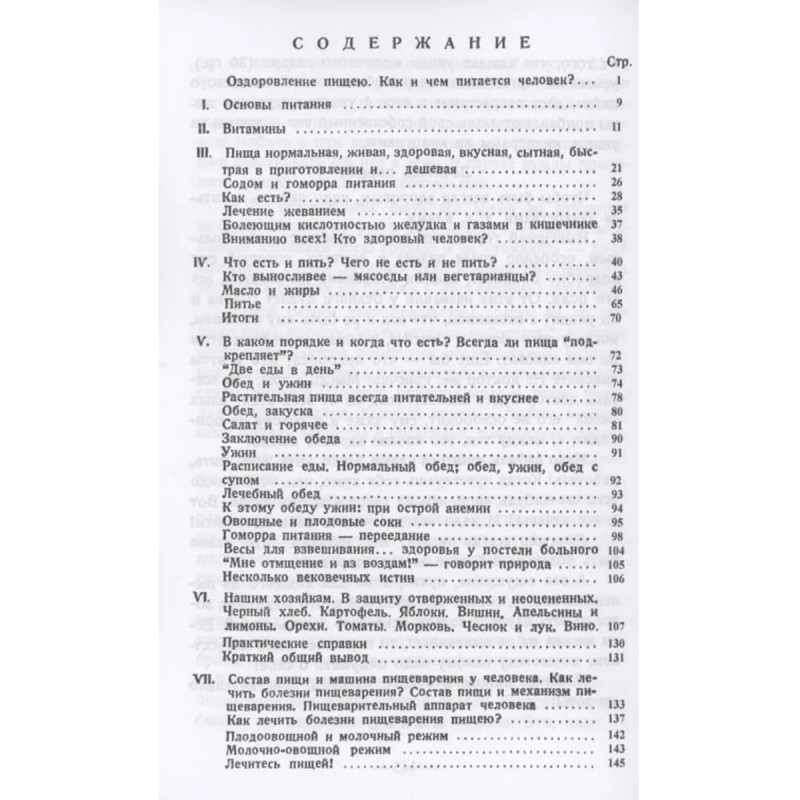 Содержание: I. Основы питания, II. Витамины, III. Пища нормальная, живая, здоровая, вкусная, сытная, быстрая в приготовлении и дешевая, IV. Что есть и пить? Чего не есть и не пить?, V. В каком порядке и когда что есть? Всегда ли пища "подкрепляет"?, VI. Нашим хозяйкам, VII. Состав пищи и машина пищеварения у человека. Как лечить болезни пищеварения? Эта поваренная диетическая книга для здоровых и больных состоит из 3-х частей и содержит рецепты, которые были почерпнуты из обширной врачебной санаторной практики. В первой части книги объясняется значение правильного питания и дается определение его понятия, указывается, чем разнятся питательные вещества от пиши вообще, какие пищевые вещества животного и растительного происхождения мы употребляем, какие искусственные питательные вещества и какие вкусовые, наконец, приводится нормальная диета для здоровых людей и несколько основных правил для кухни; во второй части имеется 573 поваренных прописей и рецептов различных блюд; в третьей части довольно подробно излаг