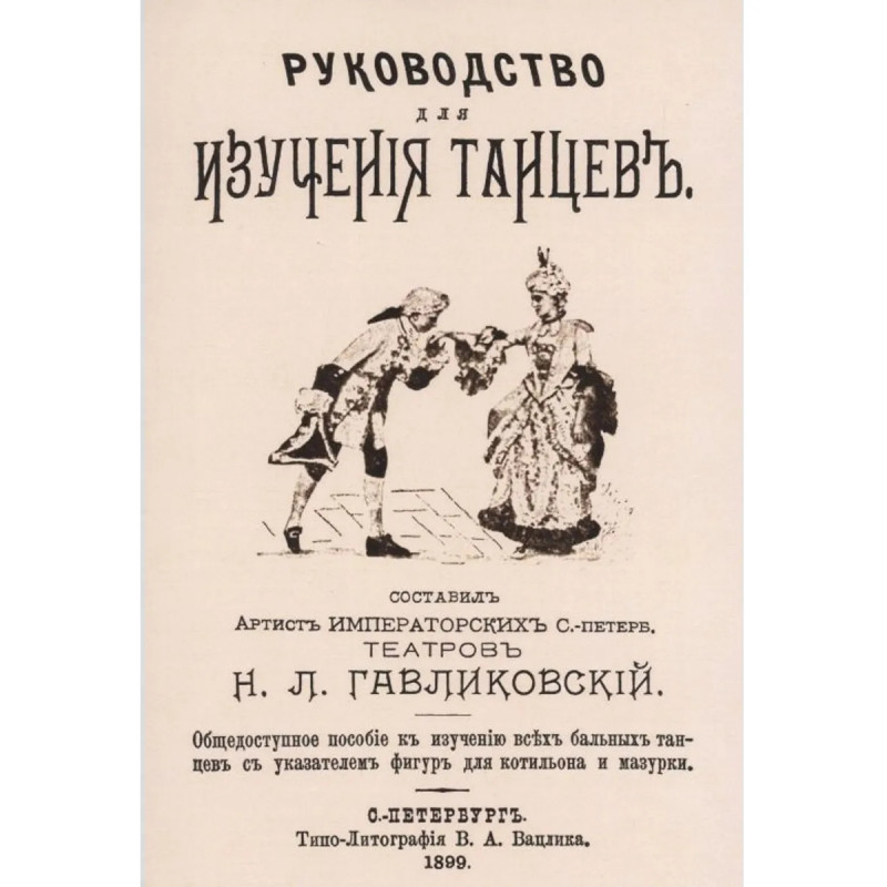 Репринт с издания. СПб., 1899. Николай Людвигович Гавликовский (1868 — 1922) — артист балета, балетовед; теоретик танца, танцмейстер. Гавликовский окончил Петербургское театральное училище в 1887 г. с похвальным листом, с 1899 г. был назначен учителем бальных танцев в этом же училище. Книга включает в себя наиболее распространенные бальные танцы и их описание: полонез, вальс в три и два па, венский вальс, польку, галоп, мазурку, кадриль, падекатр, краковяк, венгерка, котильон и том-тит. Гавликовский - автор двух танцев: шакона и миньона. В конце книги – терминологический словарь.Книга будет полезна студентам институтов культуры, учащимся театральных, хореографических учебных заведений, а также всем, кто интересуется историей и развитием танцевального искусства. Тираж 30 экз. выполнен по технологии print-on-demand.