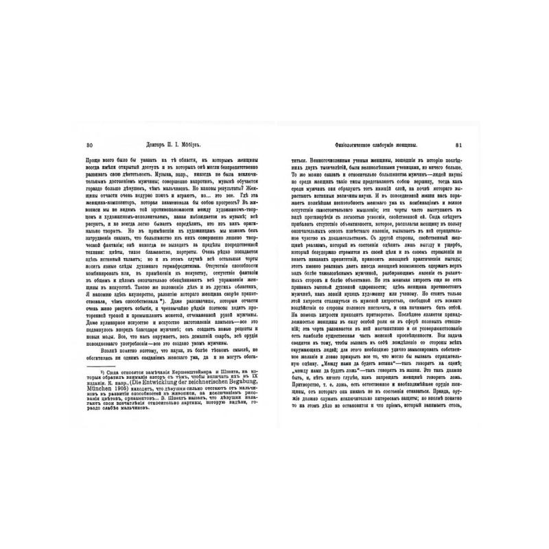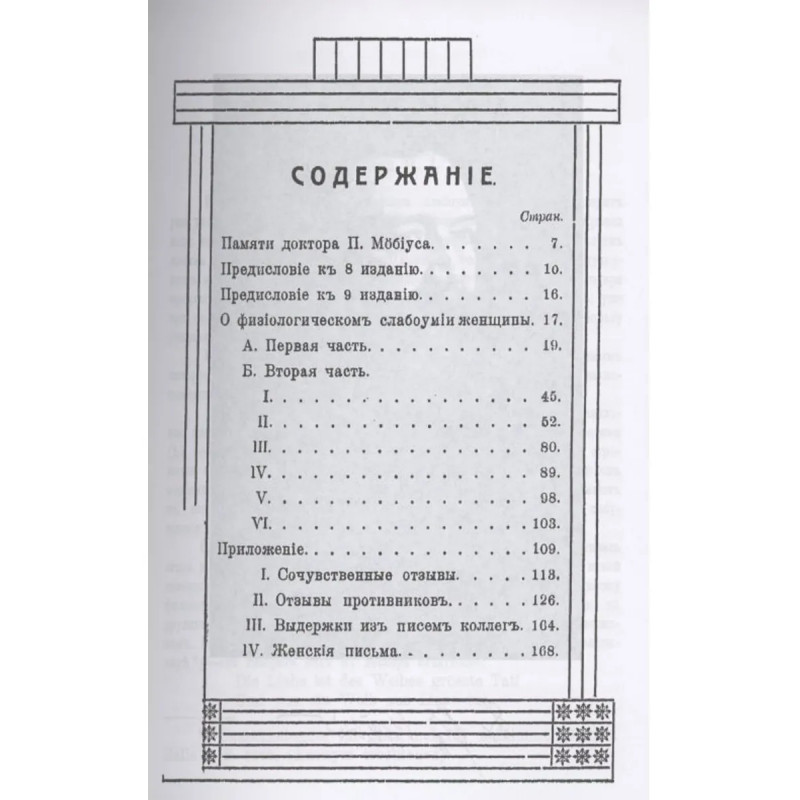 Репринт с издания. Москва, изд. Сфинкс, 1909. Проф. П. Ю. Мебиусу вполне удалось доказать несостоятельность женщин в духовном отношении. Автор женщину по уровню духовного и интеллектуального развития сравнил с негром, а мужчину - с европейцем… Автор особенно резко подчеркивает доминирующее положение, которое занимают в психике женщины эффектные склонности и инстинктивные побуждения. С приложением: Сочувственные отзывы. Отзывы противников. Выдержки из писем коллег. Женские письма.