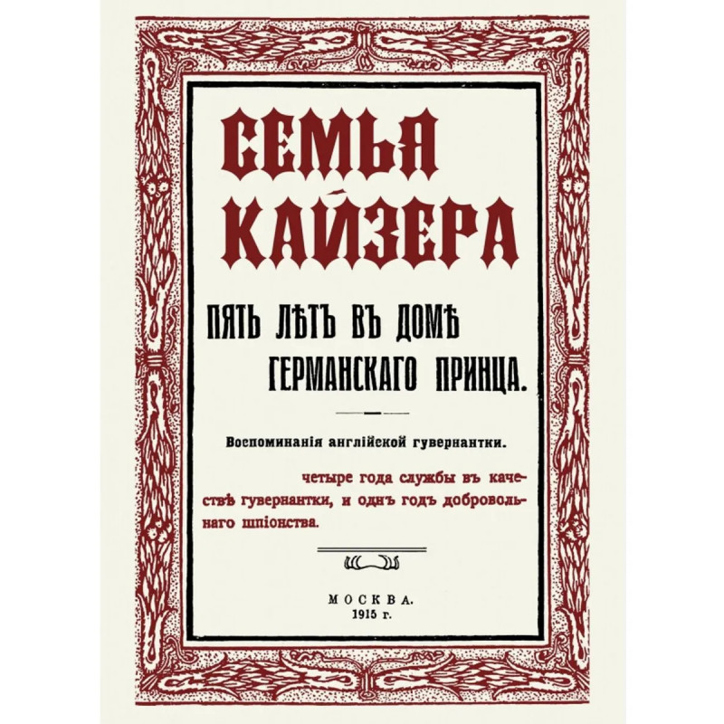 Репринт с издания. Перевод с англ. Е.Торнеус. Москва, 1915 г. Четыре года в качестве гувернандки и один год в качестве шпионки в период перед первой мировой войной и в ее начале. Взаимоотношения в семье кайзера (бытовые подробности). Тираж 30 экз. выполнен по технологии print-on-demand.