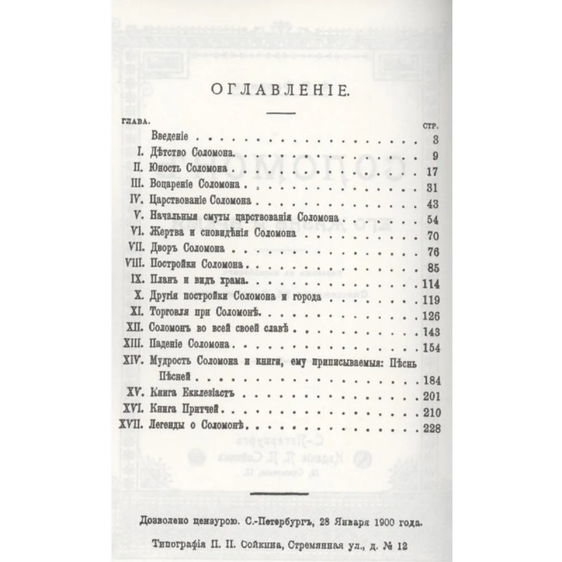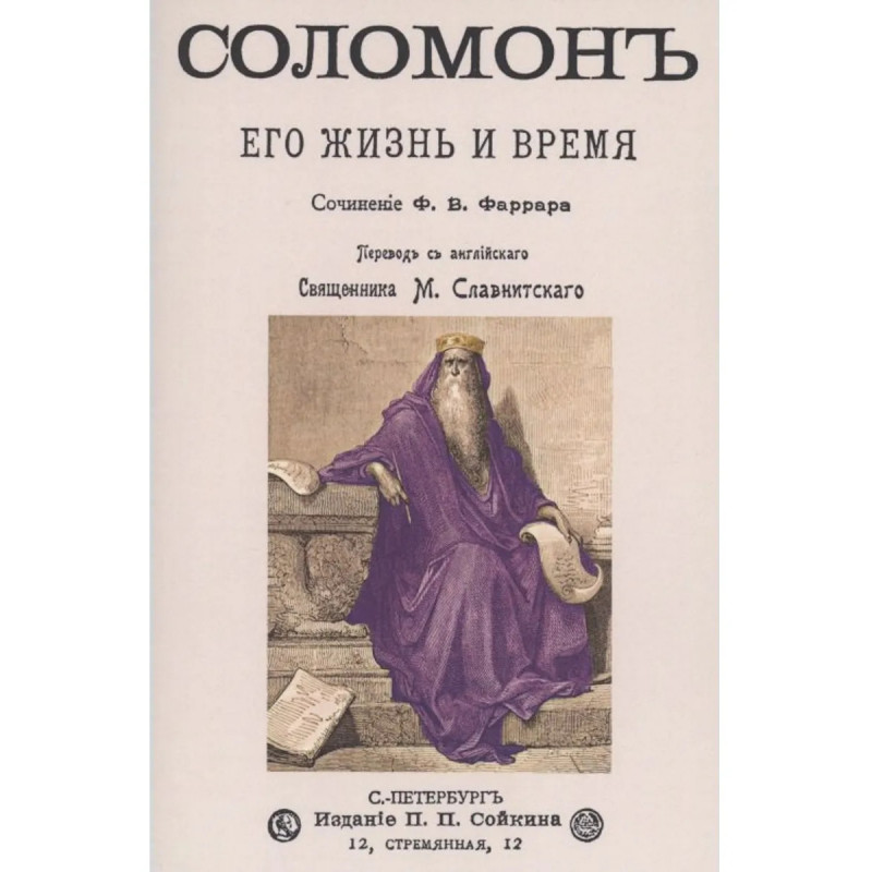 Репринт с издания. Пер. с англ. свящ. М. Славнитского СПб. изд. П. П. Сойкина 1900. Соломон - третий еврейский царь (начало Х века до н. э.), правитель объединённого Израильского царства в период его наивысшего расцвета. Сын царя Давида и Вирсавии (Бат-Шевы), соправитель Давида в первые два года своего царствования. Во время правления Соломона в Иерусалиме был построен Иерусалимский Храм — главная святыня иудаизма. Он автор ветхозаветных книг Екклесиаста, Песнь песней Соломона, Притчей Соломоновых, а также некоторых псалмов. Соломон — персонаж множества легенд, в которых выступает как мудрейший из людей и справедливый судья, нередко ему приписываются волшебные качества: понимание языка зверей, власть над джиннами. Тираж 30 экз. выполнен по технологии print-on-demand.