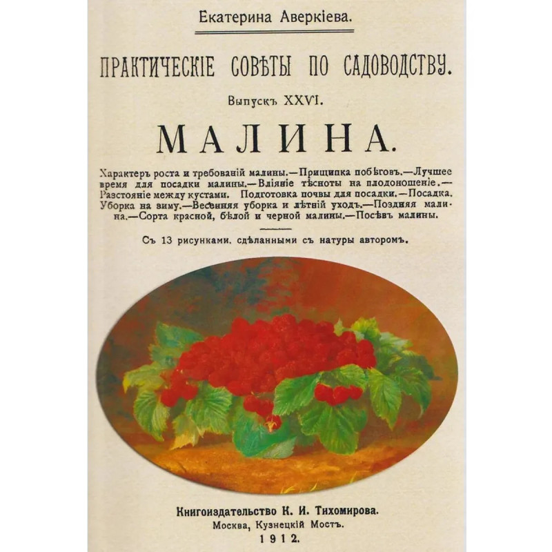 Репринт с издания. Москва, 1912. 13 илл. Аверкиева (Сорокина) Екатерина Григорьевна (1852 1918), клинская дворянка, дочь генерал-майора артиллерии Г.П. Сорокина, родственница Е.А.Алябьевой и Т.П. Пассека. Получила хорошее домашнее воспитание. Выйдя замуж за А.А. Аверкиева, поселилась в отцовском имении Василёво Клинского уезда на берегу реки Ламы, где занялась сельским хозяйством, сделав усадьбу, сад и огород образцовым имением для России. Литературные работы Аверкиевой по садоводству и огородничеству, написанные простым и доступным языком, стали замечательными практическими пособиями для хозяев всей России. Сама Екатерина Григорьевна снабжала элитными семенами всех желающих в хозяйственной России. Благодаря ей Клинский уезд стал своего рода столицей русского садоводства. Статьи Аверкиевой на эти темы печатались в газетах и журналах Неделя, Русская мысль, Вестник садоводства, Плодоводство, Плодоовощное хозяйство, Русское садоводство, Сад и огород, выходили отдельными брошюрами.