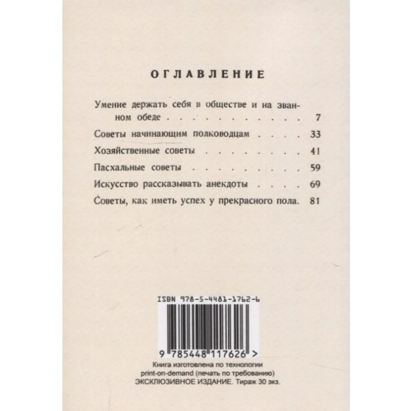 Репринт с издания. Берлин 1924. Шутливые советы молодым людям о том, как правильно держать себя в любом обществе. Содержание: УМЕНИЕ ДЕРЖАТЬ СЕБЯ В ОБЩЕСТВЕ И НА ЗВАНОМ ОБЕДЕ: Приглашение на обед, Как держать себя на свадьбе, Как держать себя на похоронах; СОВЕТЫ НАЧИНАЮЩИМ ПОЛКОВОДЦАМ (Как выигрывать войны): Как найти средства для ведения войны, Как обезопасить свою страну от вторжения врага, Первый способ ведения войны, Второй способ ведения войны (Бескровный), Морской бой, Самый хитрый способ ведения войны, Средство против аэропланов; ХОЗЯЙСТВЕННЫЕ СОВЕТЫ (Как составлять смесь): Вообще научные сведения, Этнографические штришки, Удивительные курьезы природы, Статистика, Успехи техники, Об американских миллиардерах, Еще об уме животных, Странности великих людей, Полезные советы; ПАСХАЛЬНЫЕ СОВЕТЫ: Праздничные подарки, Устройство пасхального стола, Как изготовить дешевый сытный обед, Как сэкономить на чаевых; ИСКУССТВО РАССКАЗЫВАТЬ АНЕКДОТЫ; СОВЕТЫ, КАК ИМЕТЬ УСПЕХ У ПРЕКРАСНОГО ПОЛА. Аркадий Тимофеевич Аверч