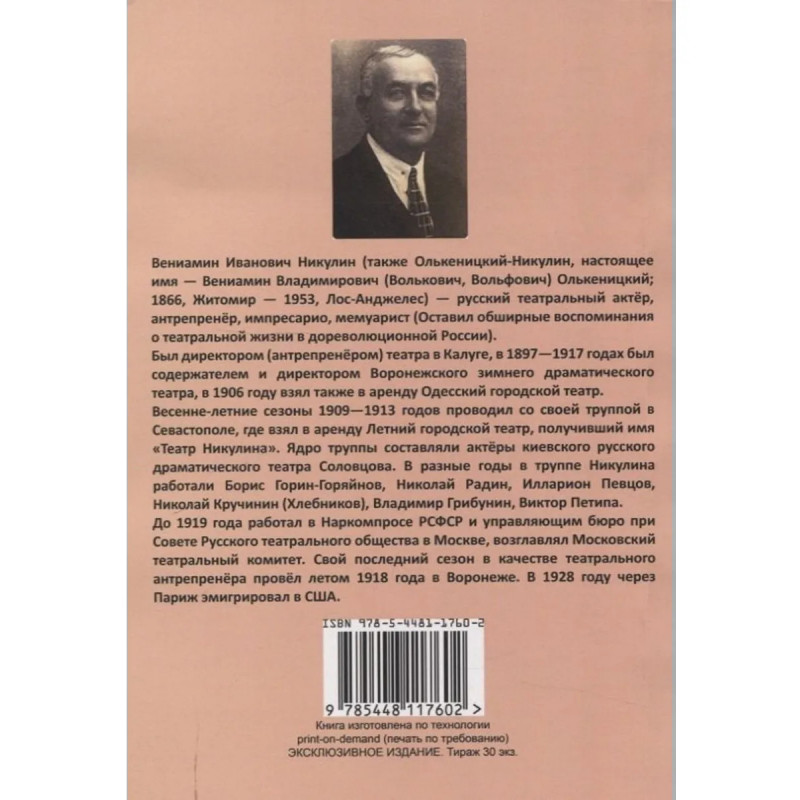 Репринт с издания. Нью-Йорк 1942. Вениамин Иванович Никулин (также Олькеницкий-Никулин, настоящее имя — Вениамин Владимирович (Волькович, Вольфович) Олькеницкий; 1866, Житомир — 1953, Лос-Анджелес) — русский театральный актёр, антрепренёр, импресарио, мемуарист (Оставил обширные воспоминания о театральной жизни в дореволюционной России). Был директором (антрепренёром) театра в Калуге, в 1897—1917 годах был содержателем и директором Воронежского зимнего драматического театра, в 1906 году взял также в аренду Одесский городской театр. Весенне-летние сезоны 1909—1913 годов проводил со своей труппой в Севастополе, где взял в аренду Летний городской театр, получивший имя «Театр Никулина». Ядро труппы составляли актёры киевского русского драматического театра Соловцова. В разные годы в труппе Никулина работали Борис Горин-Горяйнов, Николай Радин, Илларион Певцов, Николай Кручинин (Хлебников), Владимир Грибунин, Виктор Петипа. До 1919 года работал в Наркомпросе РСФСР и управляющим бюро при Совете Русского театральног
