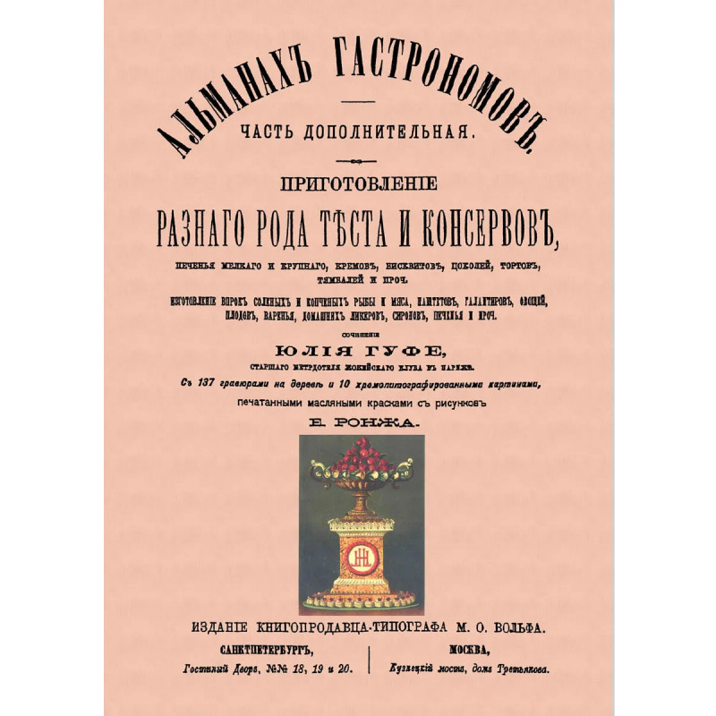 Репринт с издания. СПб., 1877. 10 цветных и много ч/б илл. Приготовление разного рода теста и консервов, печенья мелкого и крупного, бисквитов, цоколей, тортов, тямбалей и проч. Изготовление впрок соленых и копченых рыбы и мяса, паштетов, галантиров, овощей, плодов, варенья, домашних ликеров, сиропов, печенья и проч. С 137 грав. на дереве и 10 хромолитогр. картинами, печатанных масляными красками с рис. Е. Ронжа. Соч. Юлия Гуфе, старшего метрдотеля Жокейского клуба в Париже. Тираж 30 экз. выполнен по технологии print-on-demand.