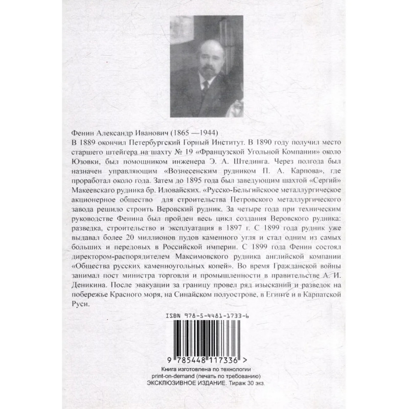 Репринт с издания. Прага, 1938. Фенин Александр Иванович (1865 —1944). В 1889 окончил Петербургский Горный Институт. В 1890 году получил место старшего штейгера на шахту № 19 «Французской Угольной Компании» около Юзовки, был помощником инженера Э. А. Штединга. Через полгода был назначен управляющим «Вознесенским рудником П. А. Карпова», где проработал около года. Затем до 1895 года был заведующим шахтой «Сергий» Макеевскаго рудника бр. Иловайских. «Русско-Бельгийскоое металлургическое акционерное общество для строительства Петровского металлургического завода решило строить Веровский рудник. За четыре года при техническим руководстве Фенина был пройден весь цикл создания Веровского рудника: разведка, строительство и эксплуатация в 1897 г. С 1899 года рудник уже выдавал более 20 миллионов пудов каменного угля и стал одним из самых больших и передовых в Российской империи. С 1899 года Фенин состоял директором-распорядителем Максимовского рудника английской компании «Общества русских каменноугольных копей». Во в