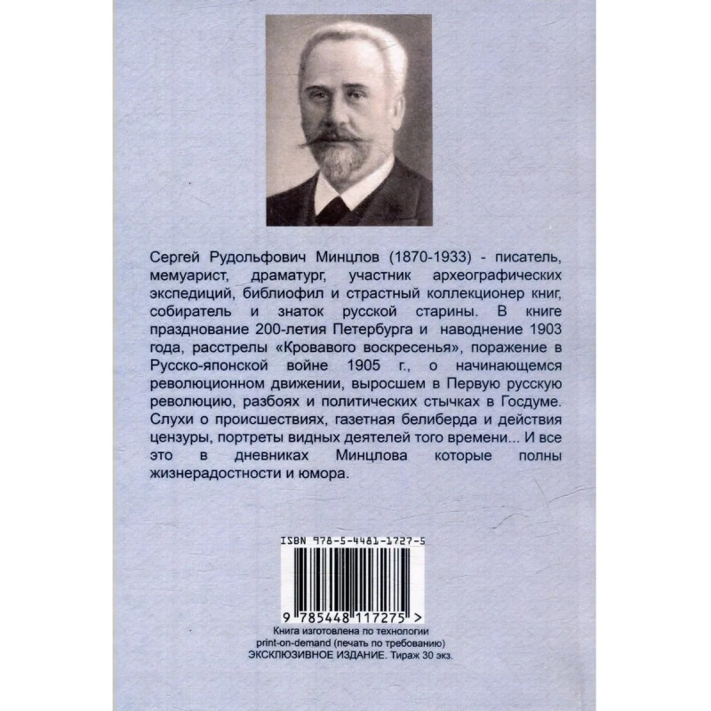 С иллюстрациями. В книге празднование 200-летия Петербурга и наводнение 1903 года, расстрелы «Кровавого воскресенья», поражение в Русско-японской войне 1905 г., о начинающемся революционном движении, выросшем в Первую русскую революцию, разбоях и политических стычках в Госдуме. Слухи о происшествиях, газетная белиберда и действия цензуры, портреты видных деятелей того времени... И все это в дневниках Минцлова которые полны жизнерадостности и юмора. Сергей Рудольфович Минцлов (1870-1933) - писатель, мемуарист, драматург, участник археографических экспедиций, библиофил и страстный коллекционер книг, собиратель и знаток русской старины. Издательство опубликовало все 3 тома воспоминаний автора. Тираж 30 экз. выполнен по технологии print-on-demand.