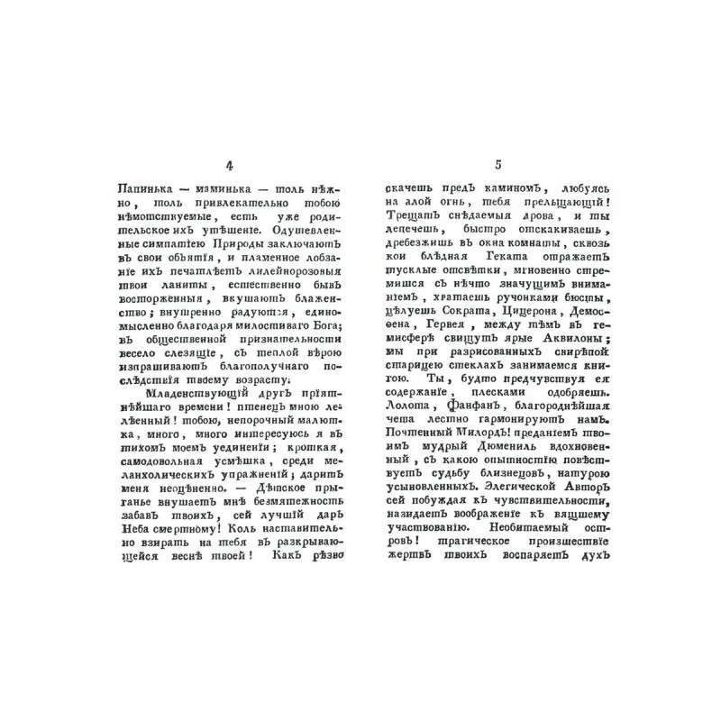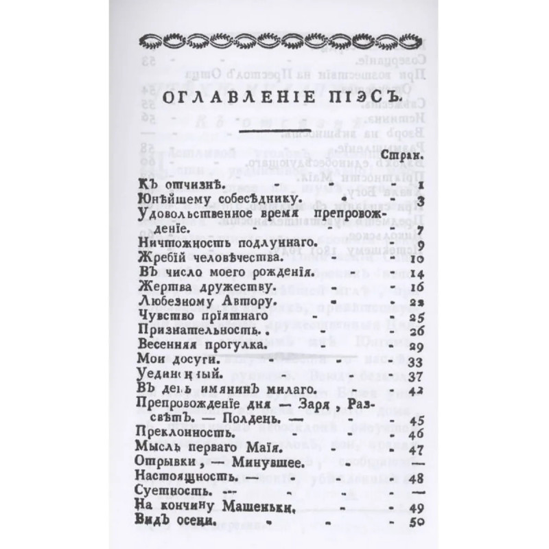 Репринт с издания. Москва, 1802. Очень смешные сегодня перлы допушкинской эпохи. «Сочинение сие и со стороны мыслей, и со стороны слога может рекомендовано быть чтению особ, любящих заниматься книгами, кои нечувствительно заставляют читающего входить в себя, обдумывать сказанное в оных и тем самым питать дух и сердце. В ней помещены мелкие отрывки, числом 36, кои Автор начертал о разных предметах, размышлению его попадавшихся, и кои приносят честь образу суждения его и отличаются тонкостию мыслей и трогательностию изъяснения. Вот некоторые из оных: “К отчизне” – “Удовольственное времяпровождение” – “Ничтожность подлунного” – “Жребий человечества” – “Чувство приятного” – “Весенняя прогулка” – “Вид осени” – “Мавзолей сердца” – “Истекшему 1801 г.” – “Гимн создавшему” и проч. и проч.» Тираж 30 экз. выполнен по технологии print-on-demand.