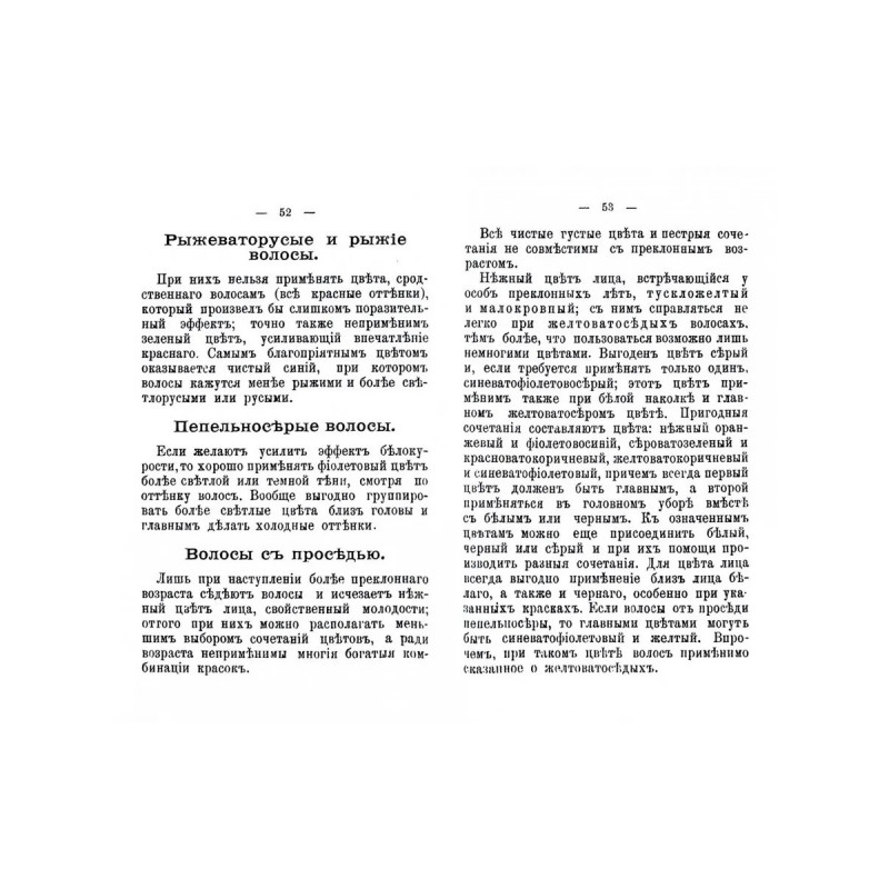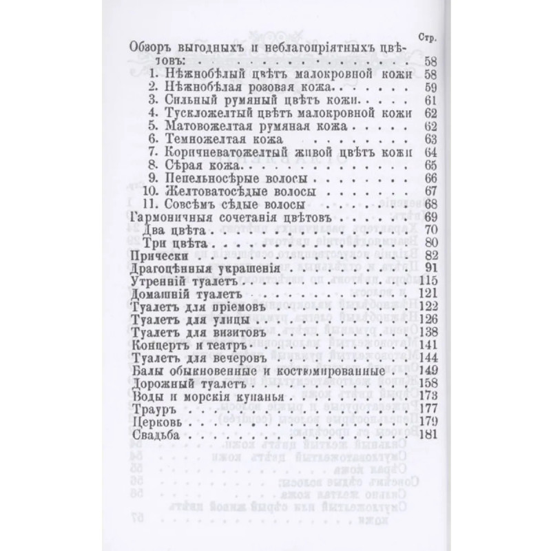Репринт с издания. СПб. Кн-во Герман Гоппе, 1891. Составители постарались дать советы, как при небольших средствах достичь лучших результатов в искусстве одеваться. В издании даются советы: по выбору цвета и сочетанию цветов, по влиянию искусственного освещения и значению оттенка кожи при выборе одежды; дается обзор «выгодных и неблагоприятных цветов», гармоничного сочетание цветов; советы по уходу за волосами и по выбору прически, драгоценных украшений; советы по подбору утреннего туалета, домашнего туалета, туалета для приемов, улицы и визитов, дорожного туалета; на случай траура, похода в церковь или на свадьбу и прочие нюансы женского туалета. Тираж 30 экз. выполнен по технологии print-on-demand.