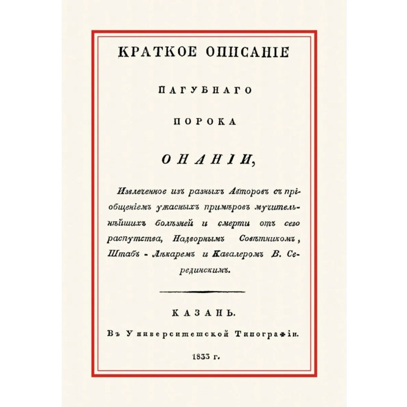 Репринт с издания. Казань, Университетская типография, 1833. Оглавление: Предуведомление. - Что есть Онанизм? - Какие первые напоминовения природы, предавшимся сему пороку? - Какую печать кладет природа на преступников, предавшихся сему распутству? - Болезни сердца, Онанизмом причиняемые. - Признаки Онаниста. - Болезни, Онанизмом причиняемые. - Примеры. - Явления после смерти Онаниста. - О предосторожностях противу Онании. Серединский Василий Тимофеевич (1785-1852) - врач, из духовного звания. Учился в московском отделении Медико-Хирургической Академии, окончил курс лекарем в 1812 г. и поступил лекарем в Минский военный госпиталь; в следующем году был переведен в 54-й егерский полк; в 1816 г. получил звание штабс-лекаря; в 1819 г. поступил в 6-ю артиллерийскую бригаду; в 1824 г. перешел в гражданское ведомство Спасским уездным врачом (в Рязанскую губернию), но уже в следующем году вернулся в военное ведомство и служил в Казанском военном госпитале; в 1826 г. перешел в Казанский гарнизонный полк, где через год