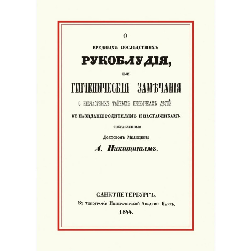 Репринт с издания. СПб. 1844 г. Сост. д-ром мед. Никитин, Александром Никитичем (1793-1858) Великолепно написанный текст, читается сейчас с упоением. В 18-ом веке эта проблема считалась очень важной для здорповья юношей. (Сегодня книга так же отличный подарок для писателей и журналистов, отличающихся чувством юмора). Книга изготовлена по технологии "печать по требованию". Тираж 30 экз.