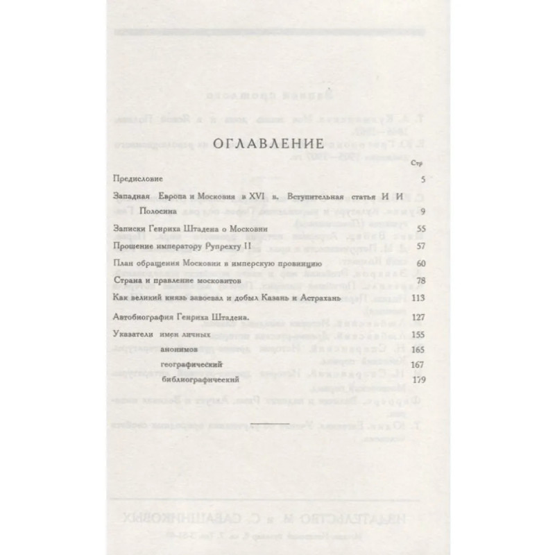 Репринт с издания Москва 1925. Печатаемые записки Генриха Штадена занимают очень крупное место в ряду источников по истории царствования Ивана Грозного. Вестфалец по происхождению, игрою судьбы заброшенный в Московию и записанный в опричнину, автор близко видел описываемые им явления и порядки, а автобиографическая форма, которую он придал своим запискам даже в той их части, которая посвящена описанию страны, делает их особенно ценными, вскрывая конкретно и безыскусно те мелкие детали повседневной жизни служилого человека XVI века, которые вряд ли возможно найти в каком-либо современном памятнике. Кроме того, бесхитростный рассказ Штадена дает нам богатый материал и для общего суждения о таком далеко невыясненном явлении в истории XVI века, как опричнина. Разбросанные по запискам отдельные намеки рисуют это учреждение в новом освещении. Из общего контекста разрозненных эпизодов и замечаний - общая картина опричнины выступает более конкретно, чем в других источниках, и ее история приобретает большую определенн