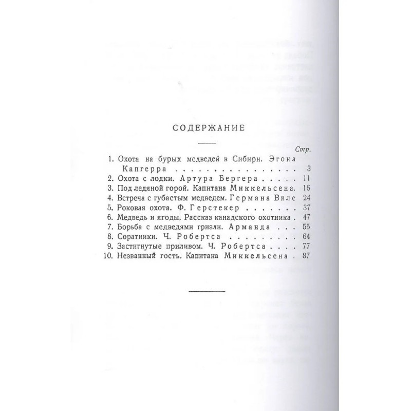 Репринт с издания. Москва, Ленинград 1928 г. 11 илл. в тексте. СОДЕРЖАНИЕ: 1. Охота на бурых медведей в Сибири. Эгона Капгерра; 2. Охота с лодки. Артура Бергера; 3. Под ледяной горой. Капитана Миккельсена; 4. Встреча с губастым медведем. Германа Виле; 5. Роковая охота. Ф. Герстекер; 6. Медведь и ягоды. Рассказ канадского охотника; 7. Борьба с медведями гризли. Арманда; 8. Соратники. Ч. Робертса; 9. Застигнутые приливом. Ч. Робертса; 10. Незванный гость. Капитана Миккельсена. Книга изготовлена по технологии "печать по требованию". Тираж 30 экз.