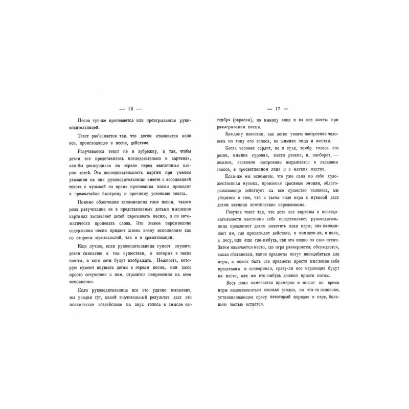 Репринт с издания Петроград 1923. Много нот. Содержание: Источники для выбора материала для музыкальных игр; Общие правила при проведении музыкальных игр; План проведения игры с пением; Краткий очерк истории и характера русской народной песни; Хороводы; Музыкальные игры для младших дошкольников; Народные песни с хороводами без сопровождения инструмента; Песни с аккомпаниментом; Игры для младших дошкольников с песнями Аренского, Кюп, Брамса; Песни немецких композиторов; Песни с играми для дошкольников старшего возраста; Народная музыка (песни без аккомпанимента); Песни с сопровождением рояля: Балакирева; Римского-Корсакова; Лядова; Гречанинова; Аренского; Кюи; Песни немецких композиторов: Брамса; Шумана; Вебера; Моцарта. Надежда Николаевна Доломанова (1870—1942) была составителем музыкальных сборников и автором методических пособий по музыкальному воспитанию детей дошкольного и младшего школьного возраста. Она написала слова к нескольким песням и хорам Ц.А. Кюи, его детской опере «Иванушка-дурачок», пьесе
