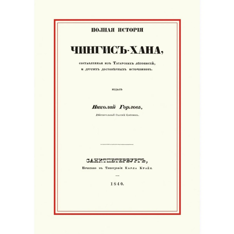 Репринт с издания СПб. 1840 г. Сочинение действительного статского советника - полная история Чингисхана, составленная из татарских летописей и других достоверных источников: книг, написанных на восточных языках, которые тщательно изучал автор во время двух периодов своего служения в Томской губернии. Автор считает свой труд первым полным описанием жизни Чингисхана. Оглавление: Происхождение Темутчина, впоследствии принявшего название Чингисхана. Принятие Темутчином прозвания Чингисхана. Война против Таянахана Найманского и ее последствия. Война против Байкара, другого владельца Найманского. Поиски против Кутшлука и Тохтабега. Предприятие Чингиса против киргизов. Покорение уйгуров. Война против Алтана, хана китайского. Война с султаном Харазанским Магометом. Поход Чингиса в великую Бухарию. Завоевания сыновей Чингисхана. Частная жизнь Чингисхана. Книга изготовлена по технологии "печать по требованию". Тираж 30 экз.