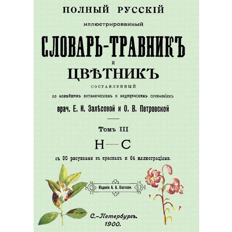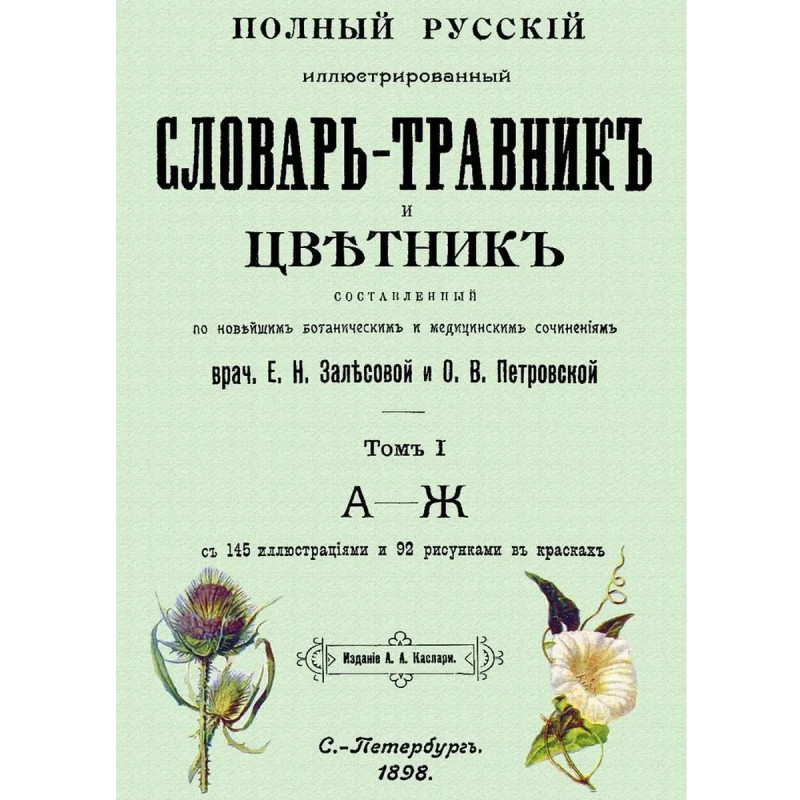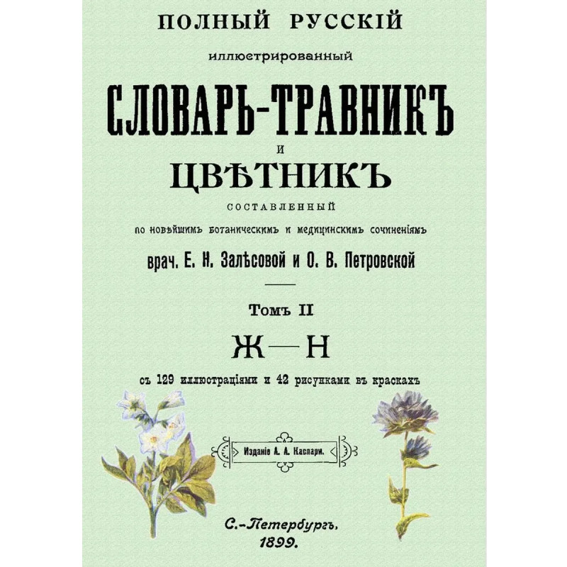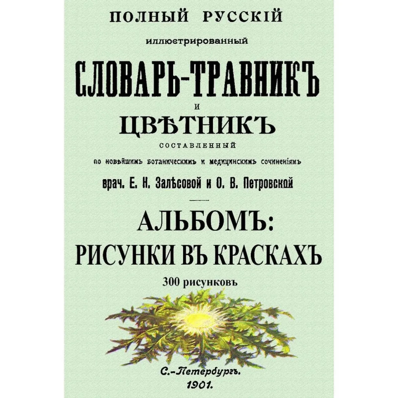Репринт с издания. СПб., 1898-1901. Предлагаемый вниманию читателей Полный русский иллюстрированный словарь-травник и цветник является самым большим по колличеству описываемых лекарственных растений России изданием, предназначенным для служения и на пользу каждой русской семьи и имеющим своей целью ознакомить читателя с флорой России. Словарь составлен по новейшим ботаническим и медицинским сочинениям врачами Е. Н. Залесовой и О. В. Петровской, с 425 иллюстрациями и 300 рисунками в красках.