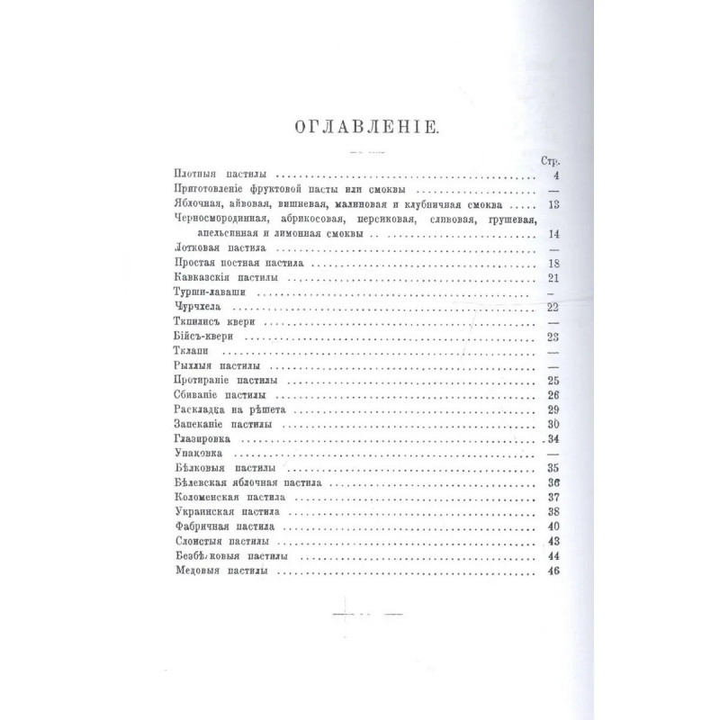 Репринт с издания. СПб. П.П. Сойкин, 1910. 17 рис. в тексте. Практическое руководство для приготовления различных сортов фруктовой и ягодной пастилы по домашним рецептам. Указываются сведения относительно условий и продолжительности хранения пастилы, способе запекания и др. Составил специалист по технике переработке фруктов и овощей Н.И. Полевицкий. Книга изготовлена по технологии "печать по требованию". Тираж 30 экз.