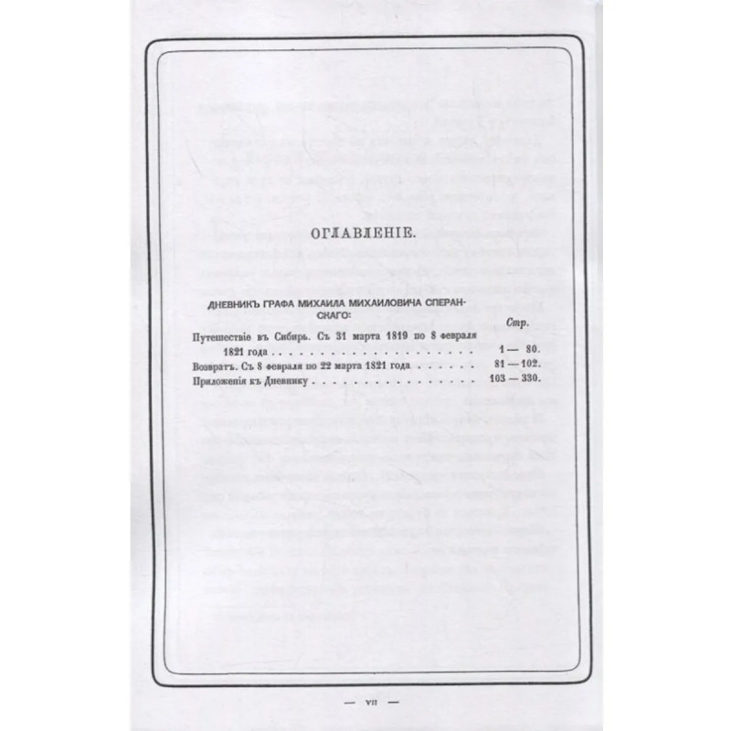 Репринт с издания: Путешествие в Сибирь с 31 марта 1819 г. по 8 февраля 1821 г. СПб. 1872 г. Граф (1839) Михаил Михайлович Сперанский (1772 — 1839) — Ближайший сподвижник Александра I , он был вторым лицом в империи. В 1816—1819 гг. пензенский губернатор. В 1819 года Сперанский неожиданно получил новое назначение — генерал-губернатором Сибири. По поручению императора Сперанский должен был провести ревизию Сибири. 6 мая 1819 года Сперанский отправился из Пензы в Сибирь. 29 августа 1819 года Сперанский прибыл в Иркутск — центр губернии, где должен был находиться генерал-губернатор. В результате гласности были отстранены от всех должностей его предшественник сибирский генерал-губернатор отец будущего лидера декабристов И. Б. Пестель, два губернатора — томский и иркутский. В 1821 году Сперанский вернулся в столицу. Тираж 30 экз. выполнен по технологии print-on-demand.