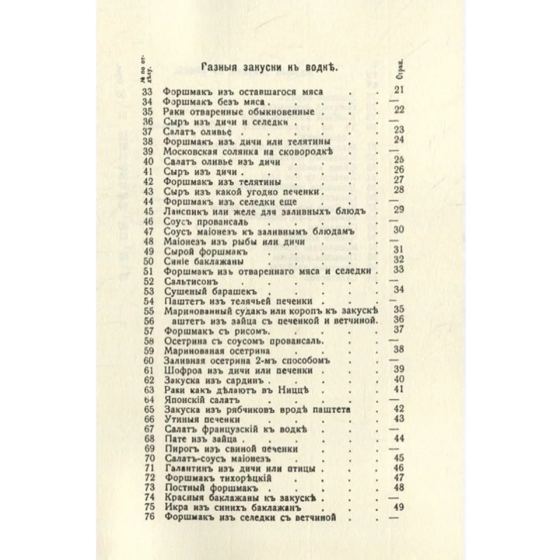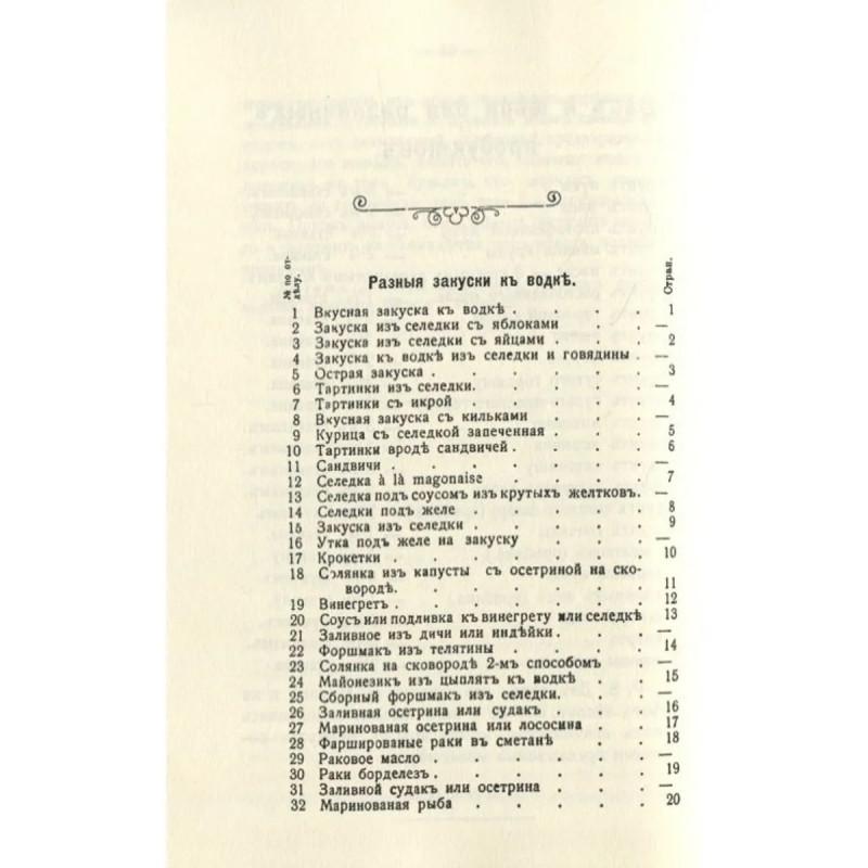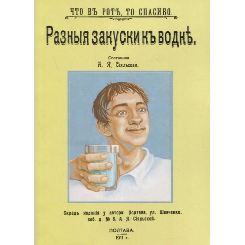 Репринт с издания. Полтава, 1911. Раздел "Разные закуски к водке" из кулинарного сборника "Что в рот, то спасибо". 97 рецептов. Тираж 30 экз. выполнен по технологии print-on-demand.
