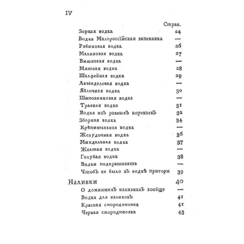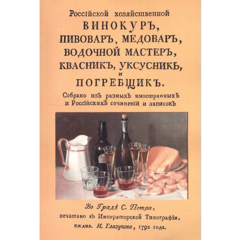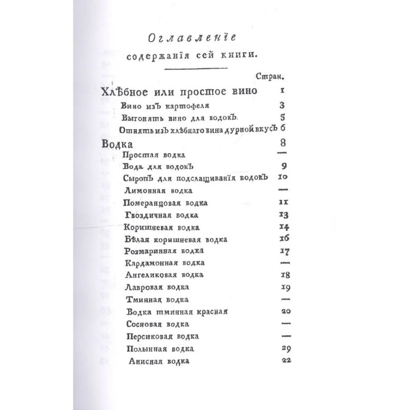 Репринт с издания. СПб. 1792. Хлебное или простое вино, Вино из картофеля, Выгонять вино для водок, Отнять из хлебного вина дурной вкус, Водка, Простая водка, Вода для водок, Сироп для подслащивания водок, Лимонная водка, Гвоздичная водка, Коришневая водка, Белая коришневая водка, Розмаринная водка, Карадмонная водка, Ангеликовая водка, Лавровая водка, Тминная водка, Водка тминная красная, Сосновая водка, Персиковая водка, Полынная водка, Анисная водка, Зорная водка, Водка Малороссийская запеканка, Рябиновая водка, Малиновая водка, Вишневая водка, Мятная водка, Шалфейная водка, Лавенделевая водка, Яблочная водка, Шиповниковая водка, Травная водка, Водка из разных кореньев, Зборная водка, Крепительная водка, Желудочная водка, Миндальная водка, Желтая водка, Голубая водка, Водки подкрашивать, Чтоб не было в водке пригори, Наливки, О домашних наливках вообще, Водка для наливок, Красная смородиновка, Черная смородиновка, Черная смородиновка, Вишневка, Рябиновка, Костяничная наливка, Крыжовниковка, Малиновка, Клуб