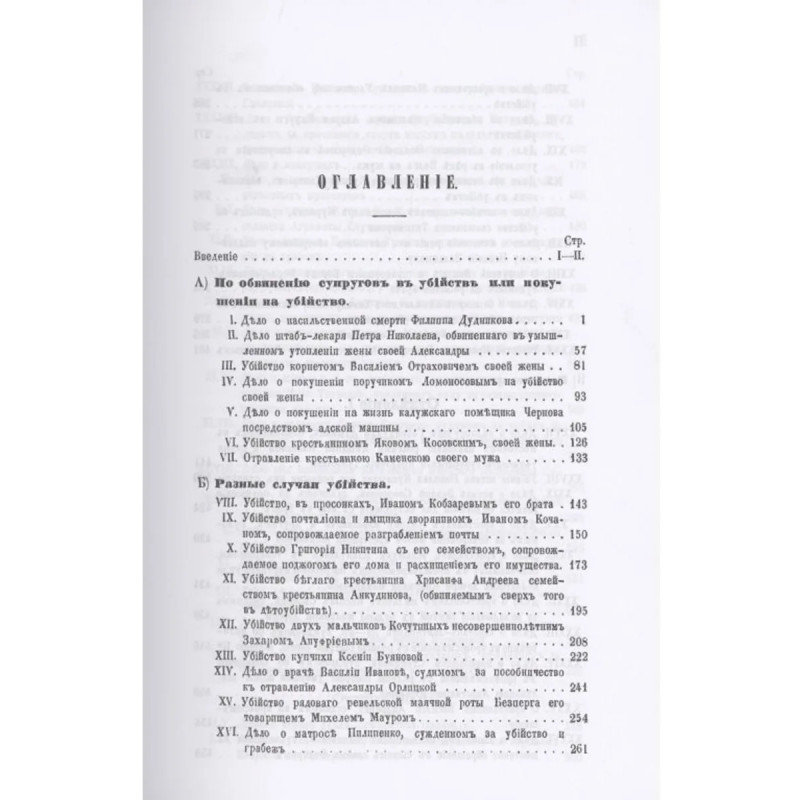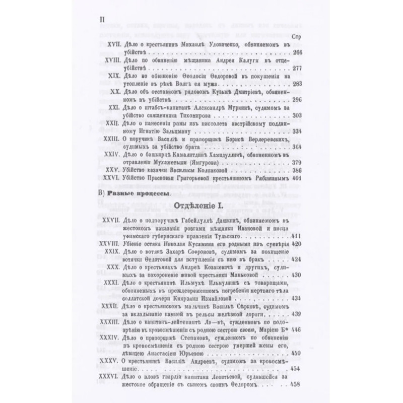 Репринт с издания. СПб. Тип. т-ва «Общественная Польза», 1866-1868. В I томе содержатся дела: о надв. сов. Ю. Жуковском и б. ответственном редакторе журнала "Современник" А. Пыпине, обвиняемых в оскорблении дворянского сословия; дело по обвинению губ. секретаря Суворина в нарушении постановлений печати; о расхищении тайным советником Гаевским и статским советником Яковлевым из сумм духовно-учебного управления; об оскорблении колл. секретарем Н. Протопоповым графа Коскуля и т.д. Во II том помещена группа дел, происходивших от жестокого отношения помещиков к крепостным крестьянам до их освобождения и многие другие, в том числе: дело об убийстве Лермонтова на дуэли, о рядовом Федорове, судимым за написание своей кровью росписки о продажи души черту и за побег; о бароне Местмахере, полковнике Потемкине и др.