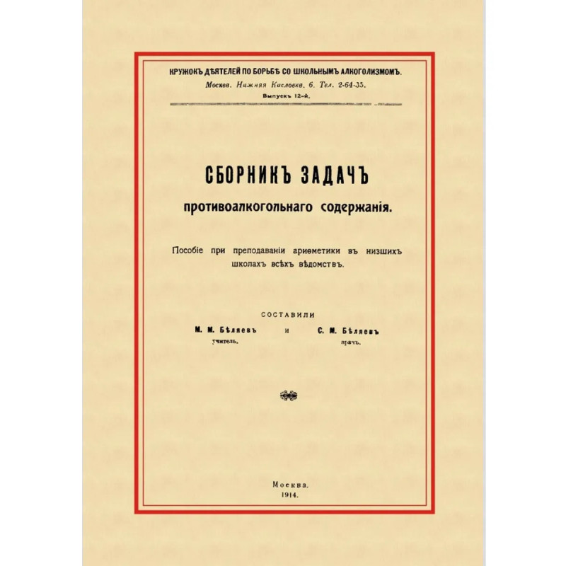 Репринт с издания. Москва 1914. Смешные (сегодня) задачи. Пособие при преподавании арифметики в низших школах всех ведомств. Кружок деятелей по борьбе со школьным алкоголизмом. Составили М. М. Беляев (учитель) и С. М. Беляев (врач). Тираж 30 экз. выполнен по технологии print-on-demand.