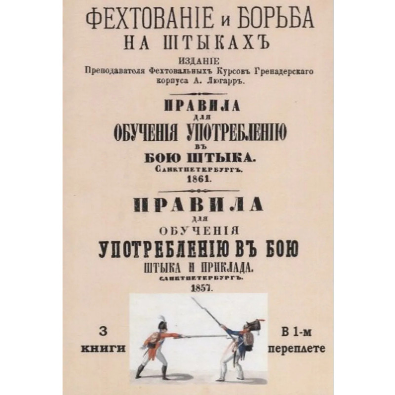 Употребление в бою штыка и приклада. 3 книги в 1 переплете. .Репринтный сборник: .1) Пособие военным инструкторам для преподавания штыкового боя в войсках по системе принятой на Офицерских фехтовальных курсах Гренадерского Корпуса. Издал преподаватель фехтовальных курсов Гренадерского корпуса А. Люгарр. - Москва, типо-лит. М. Кинеловской, 1908. .2) Правила для обучения употреблению в бою штыка. Санкт-Петербург. Военная тип., 1861. С 23 илл. СПб. 1857. .3) Правила для обучения употреблению в бою штыка и приклада. СПб. Военная тип., 1857.